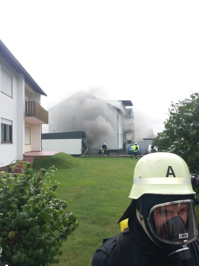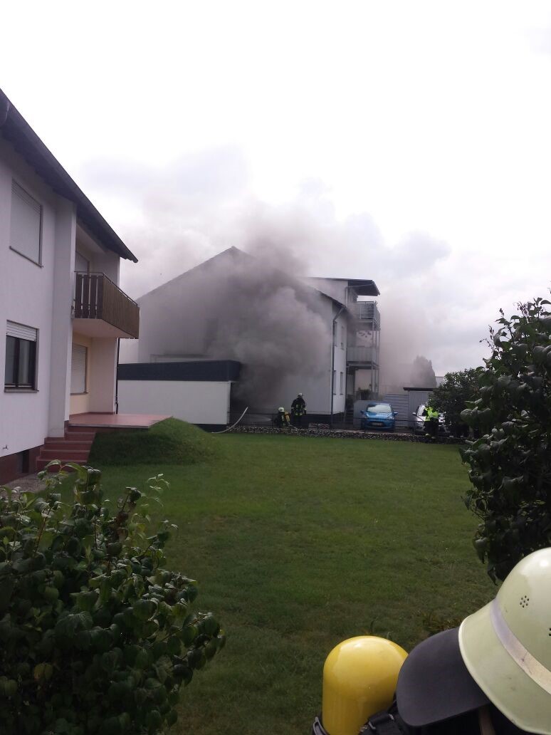 Es rüstete sich bereits auf der Anfahrt ein Trupp unter schweren Atemschutz aus. An der Einsatzstelle angekommen sprach sich der Zugführer der Pyrbaumer Feuerwehr mit dem Einsatzleiter vor Ort ab und erkundete die Lage. Es brannte eine Doppelgarage in der sich neben Reifen noch andere diverse Gegenstände befanden. Ein Auto befand sich zum Zeitpunkt des Brandes nicht darin. Die Feuerwehr Postbauer-Heng öffnete die Garagentore, unter schweren Atemschutz um sich Zutritt zu verschaffen und den Brand abzulöschen – dies gelang auch nach kürzester Zeit. Es wurden die Brandlasten ins freie gebracht um dort nochmals abgelöscht zu werden. Mit Hilfe der Wärmebildkamera wurden die Objekte auf versteckte Glutnester kontrolliert. Bereits während der Löscharbeiten wurde der Überdrucklüfter in Stellung gebracht um die Garage schnellstmöglich rauchfrei zu bekommen. Dank des schnellen Eingreifens der Feuerwehren konnte ein noch größerer Schaden bzw. ein Übergreifen der Flammen auf das direkt angrenzende Wohnhaus verhindert werden.