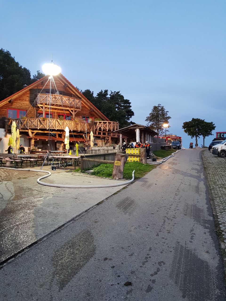 Zur Brandbekämpfung wurde ein Löschangriff aufgebaut. Atemschutzgeräteträger in drei Trupps holten die gefährdeten Personen aus dem Gebäude. Aufgrund der schwierigen Löschwassersituation wurde mit den wasserführenden Fahrzeugen der Feuerwehren Postbauer-Heng und Pyrbaum ein Pendelverkehr eingerichtet. Das Löschwasser wurde in zwei Faltbehältern mit 5.000 Liter Fassungsvermögen zwischengespeichert. Zudem wurde aus einem Oberflurhydranten vom Parkplatz Trend eine lange Schlauchleitung zum Brandobjekt verlegt. Dazu mussten Tragkraftspritzen in die Leitung integriert werden um den Druck aufrecht zu erhalten, da der Höhenunterschied von ca. 50 Höhenmeter und die Länge von ca. 1,5 km ausgeglichen werden musste.
