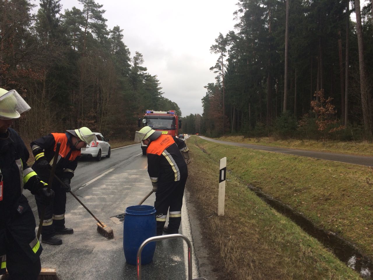 Die Feuerwehr Pyrbaum wurde am 16.03.2018 um 13:55 Uhr zu einer ausgedehnten Ölspur im Ortsgebiet Pyrbaum bis nach Dennenlohe mittels Telefon und Sirene alarmiert.