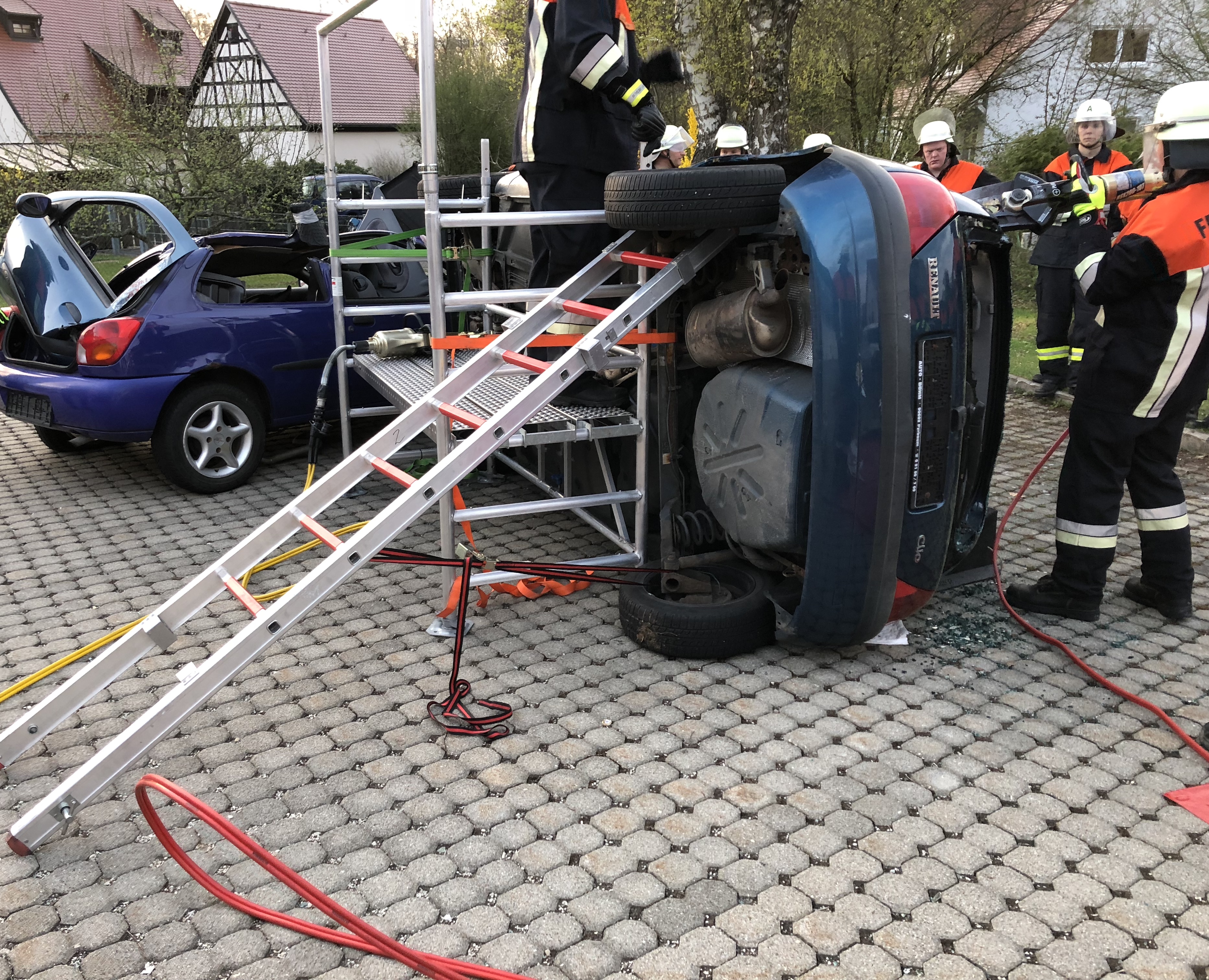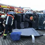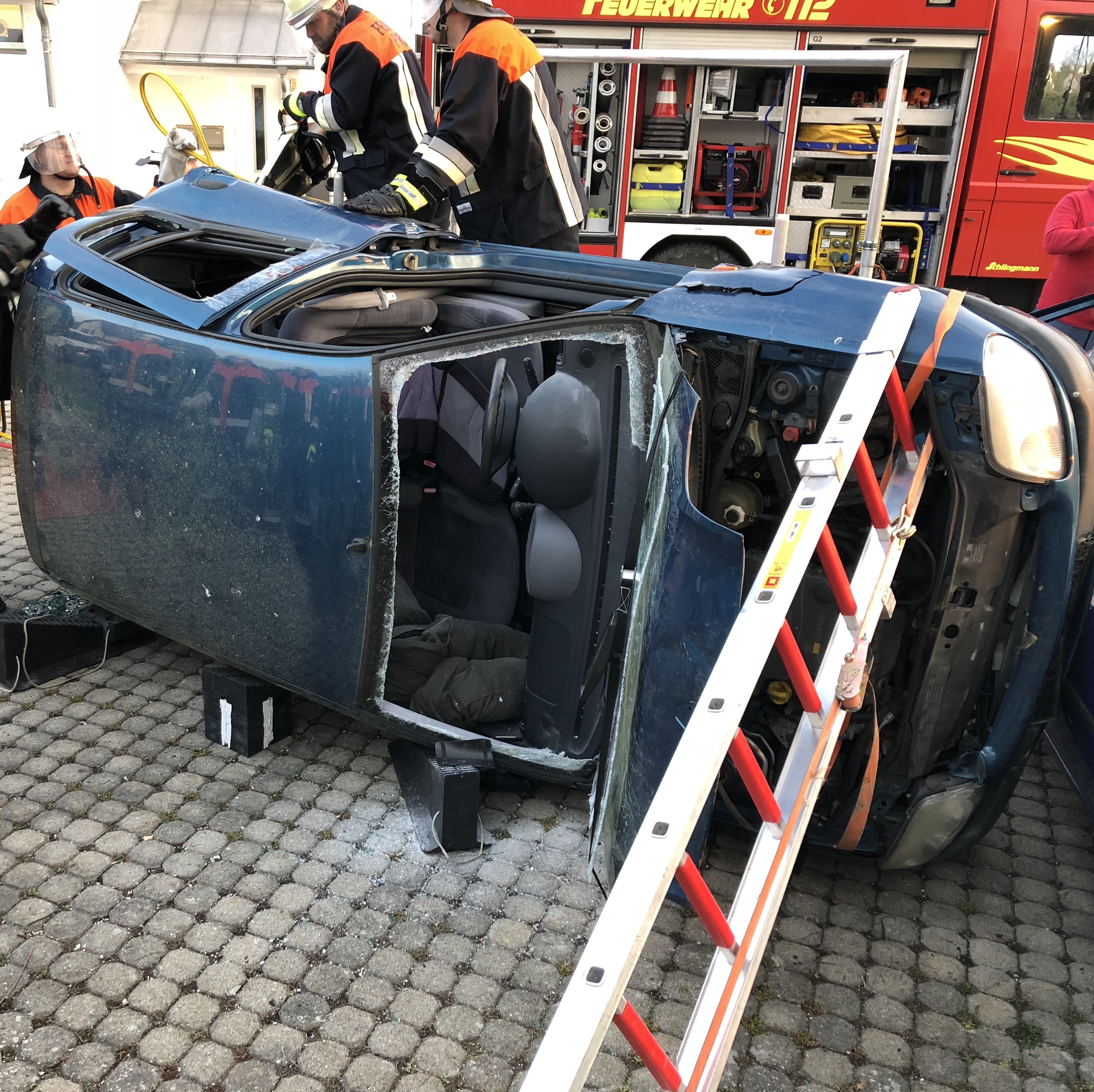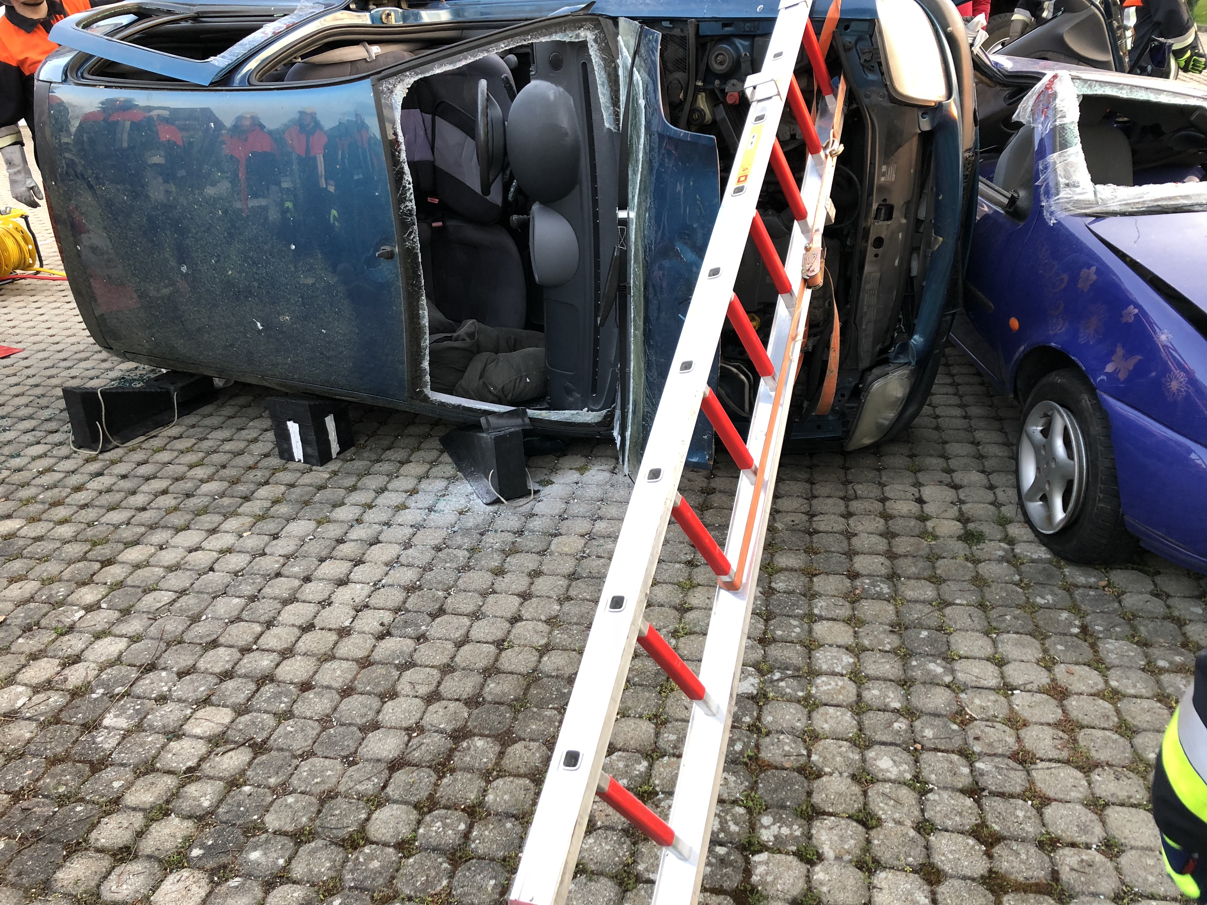 Ein PKW lag auf der Seite, eine „Person“ im Fahrzeug. Während der Gruppenführer die Lage erkundete, übernahm ein Trupp die Verkehrsabsicherung, ein anderer stellte den Brandschutz sicher und weitere bereiteten die Bereitstellungsplane vor und stellten die benötigten Gerätschaften bereit.