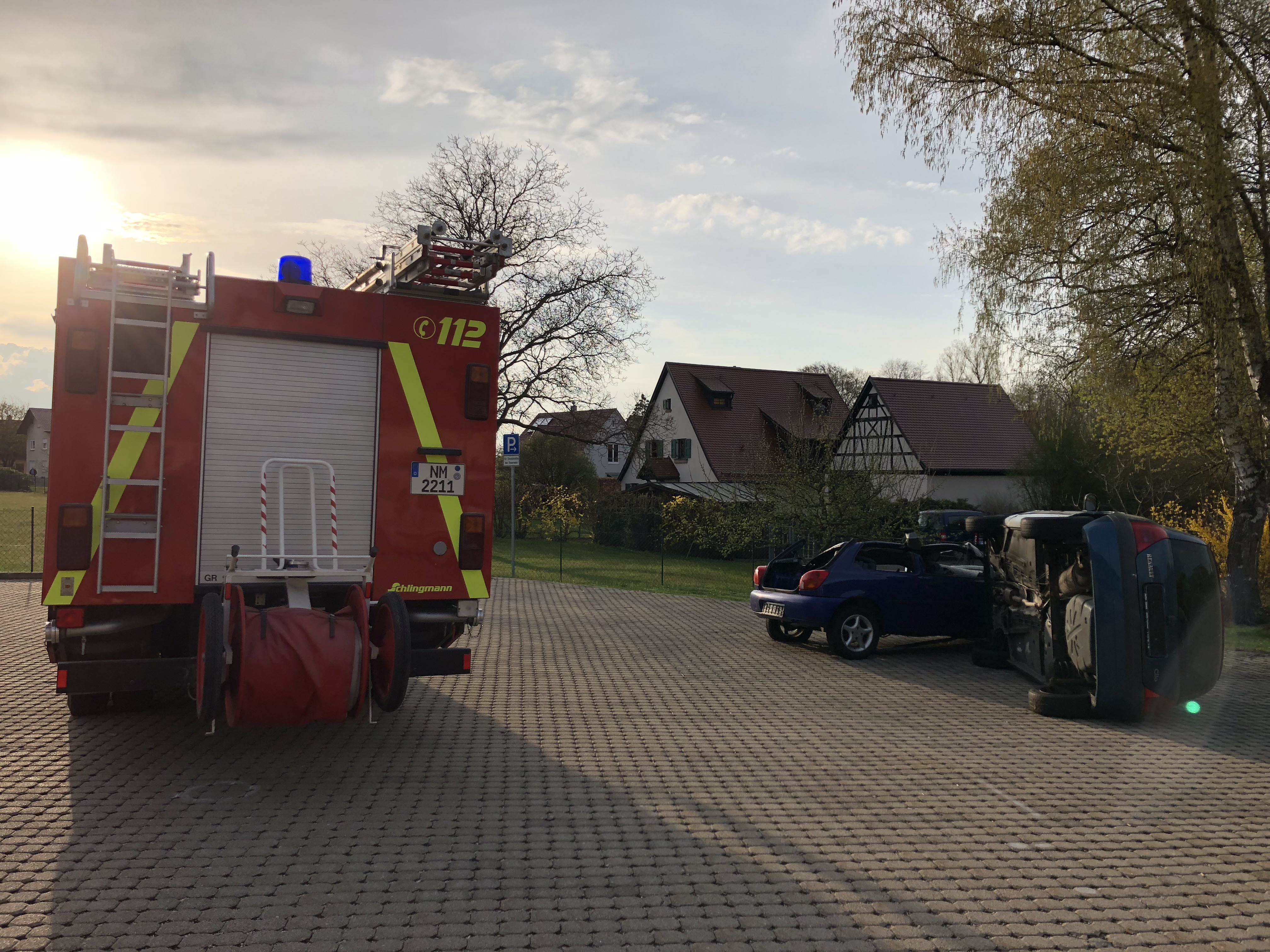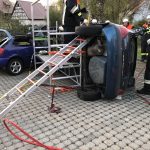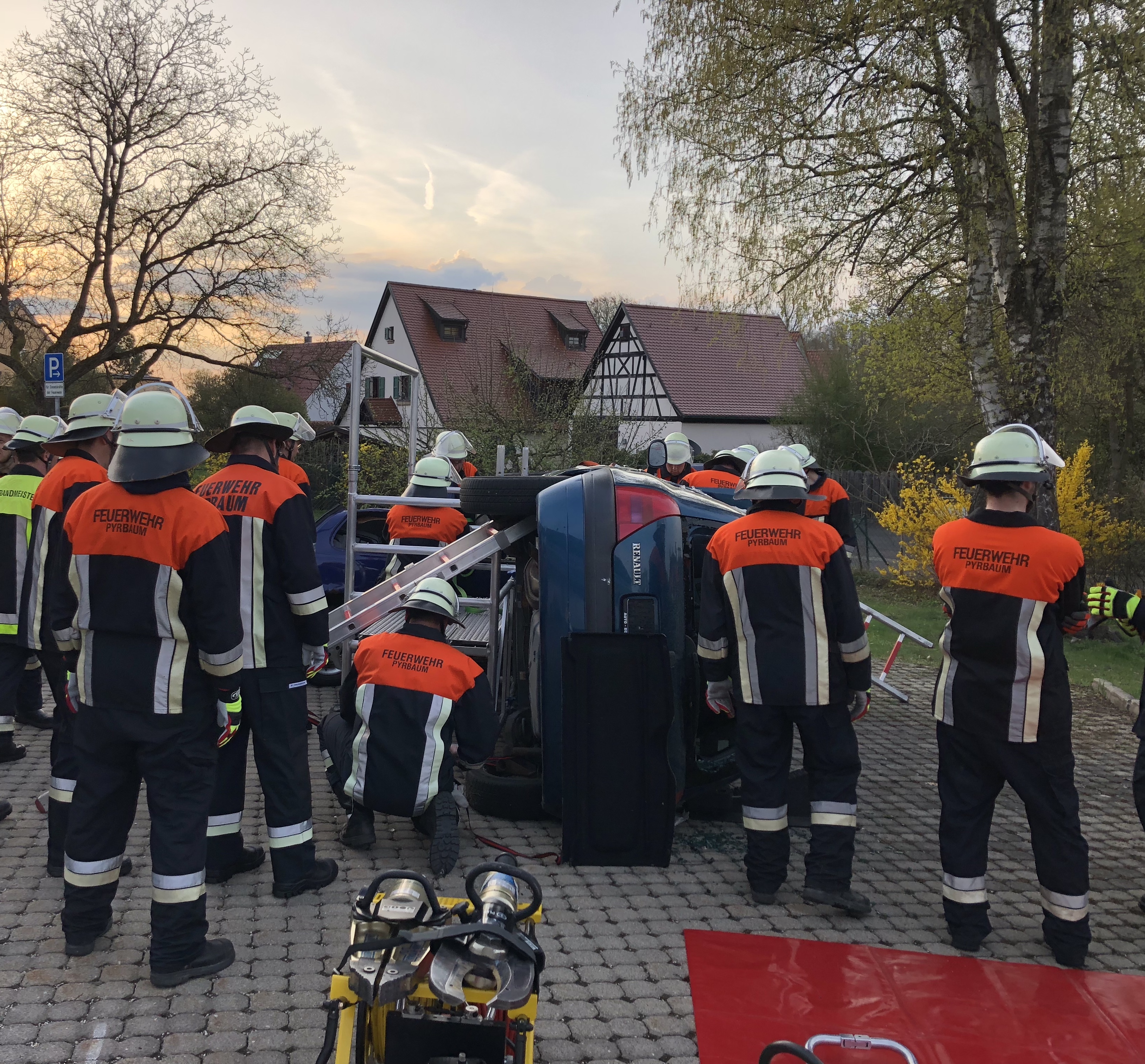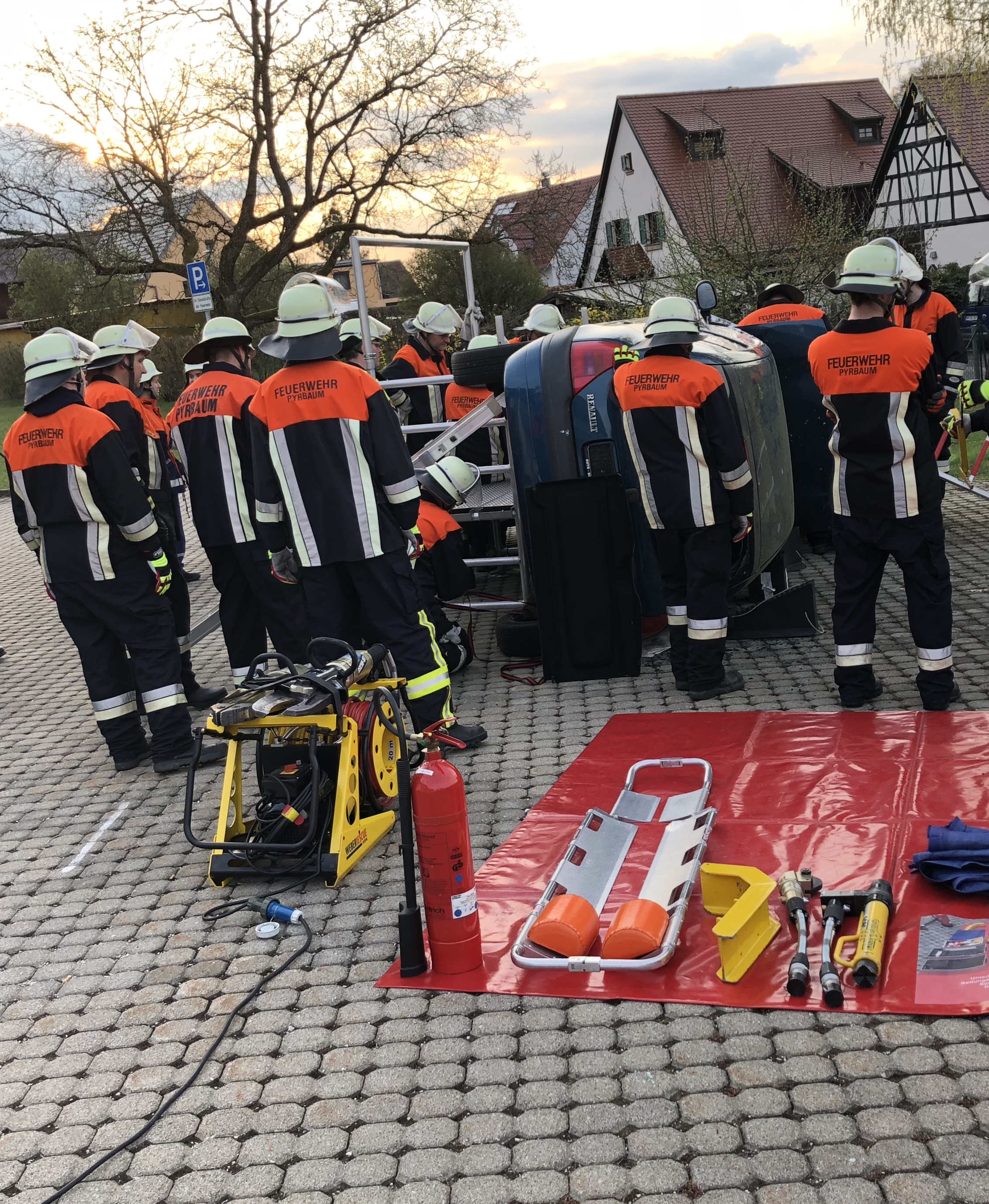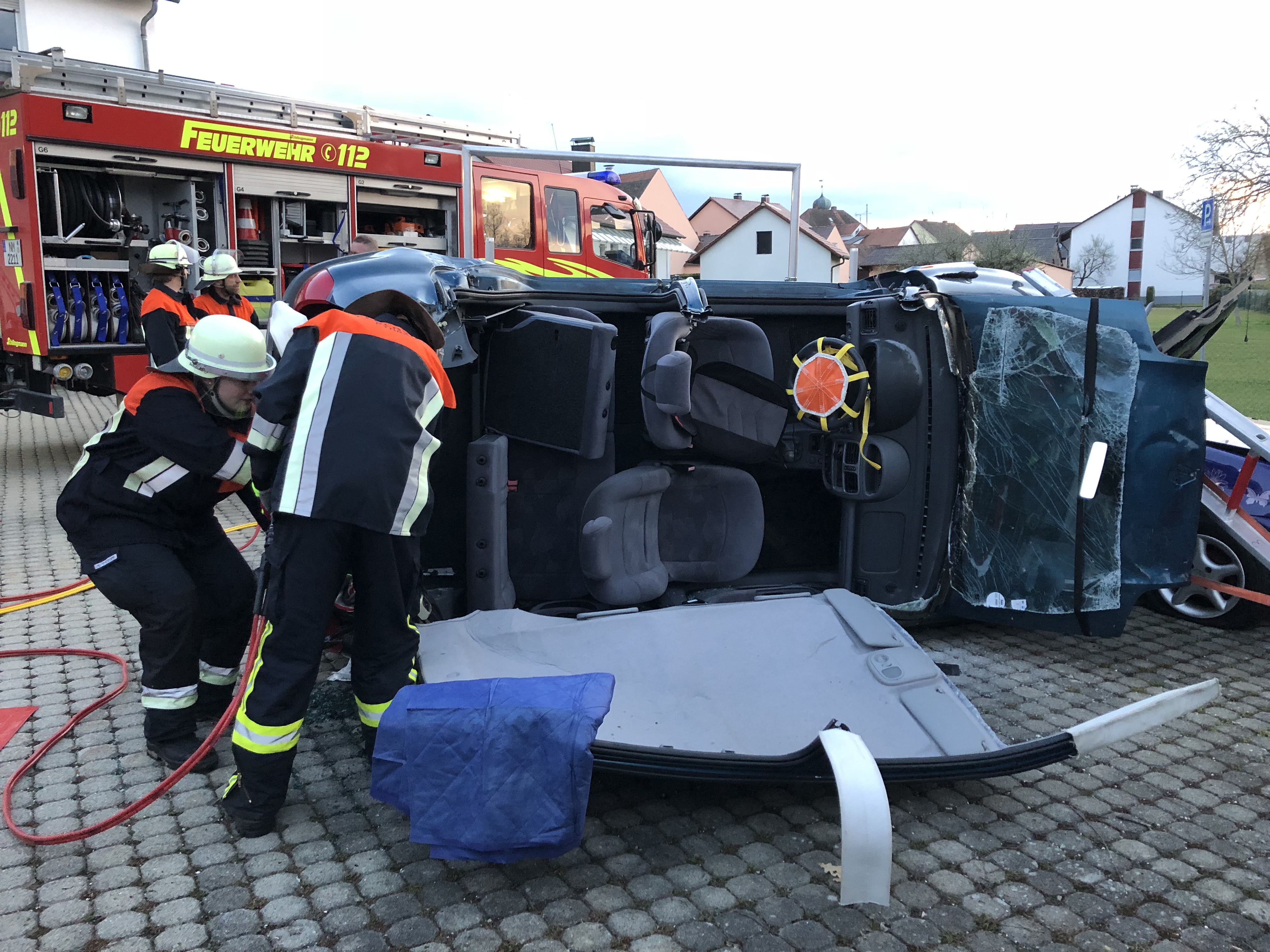 Ein PKW lag auf der Seite, eine „Person“ im Fahrzeug. Während der Gruppenführer die Lage erkundete, übernahm ein Trupp die Verkehrsabsicherung, ein anderer stellte den Brandschutz sicher und weitere bereiteten die Bereitstellungsplane vor und stellten die benötigten Gerätschaften bereit.