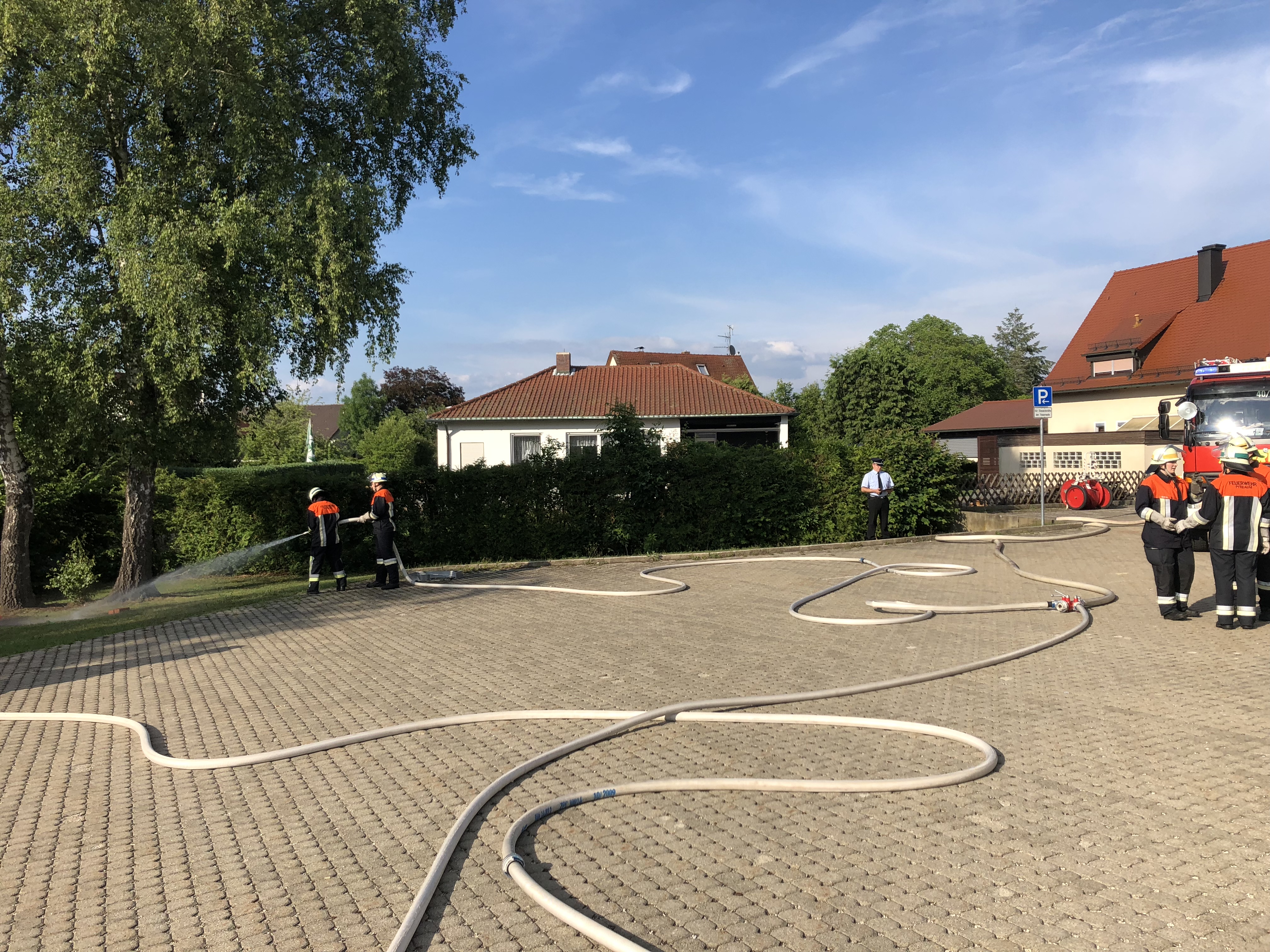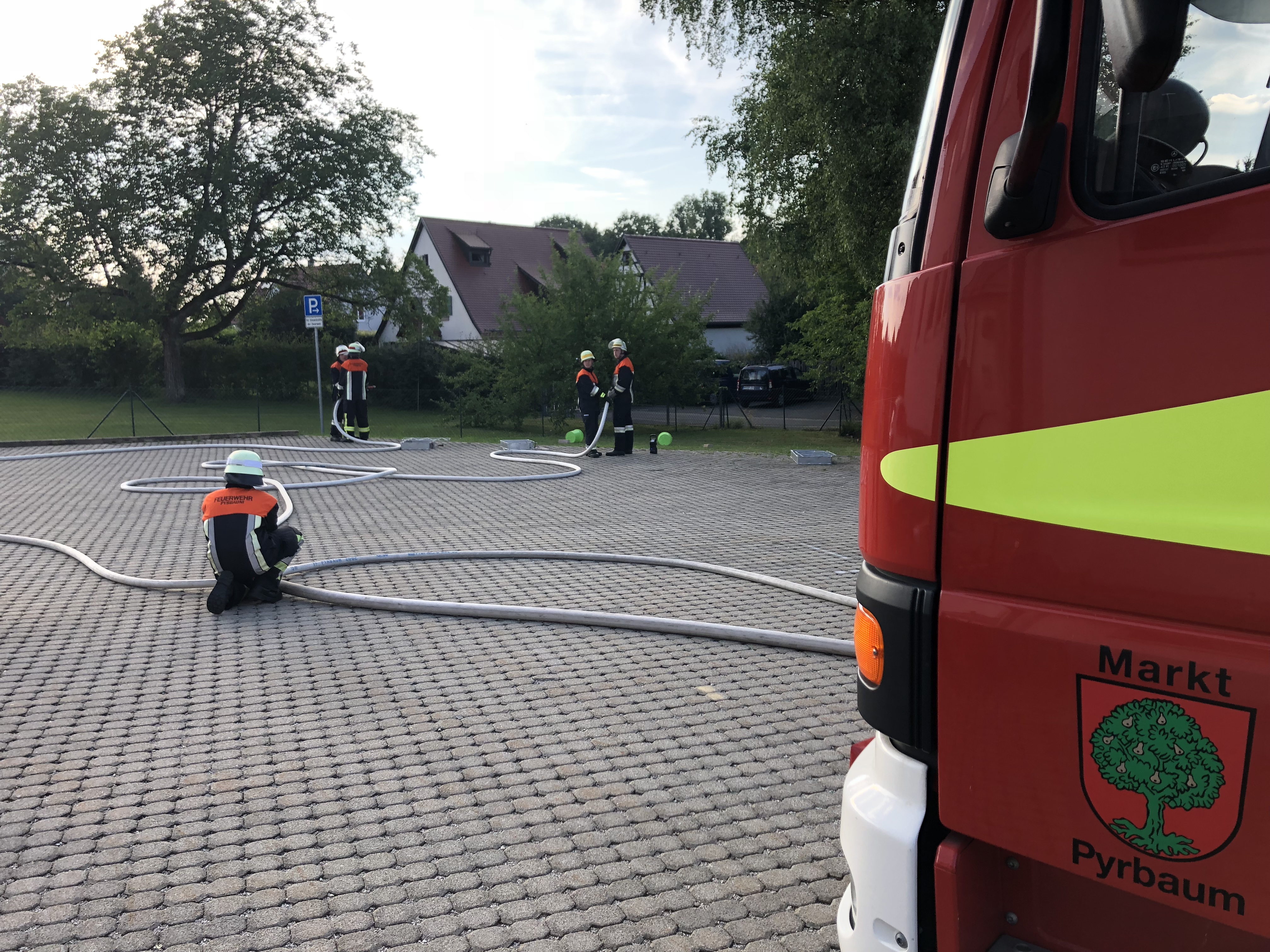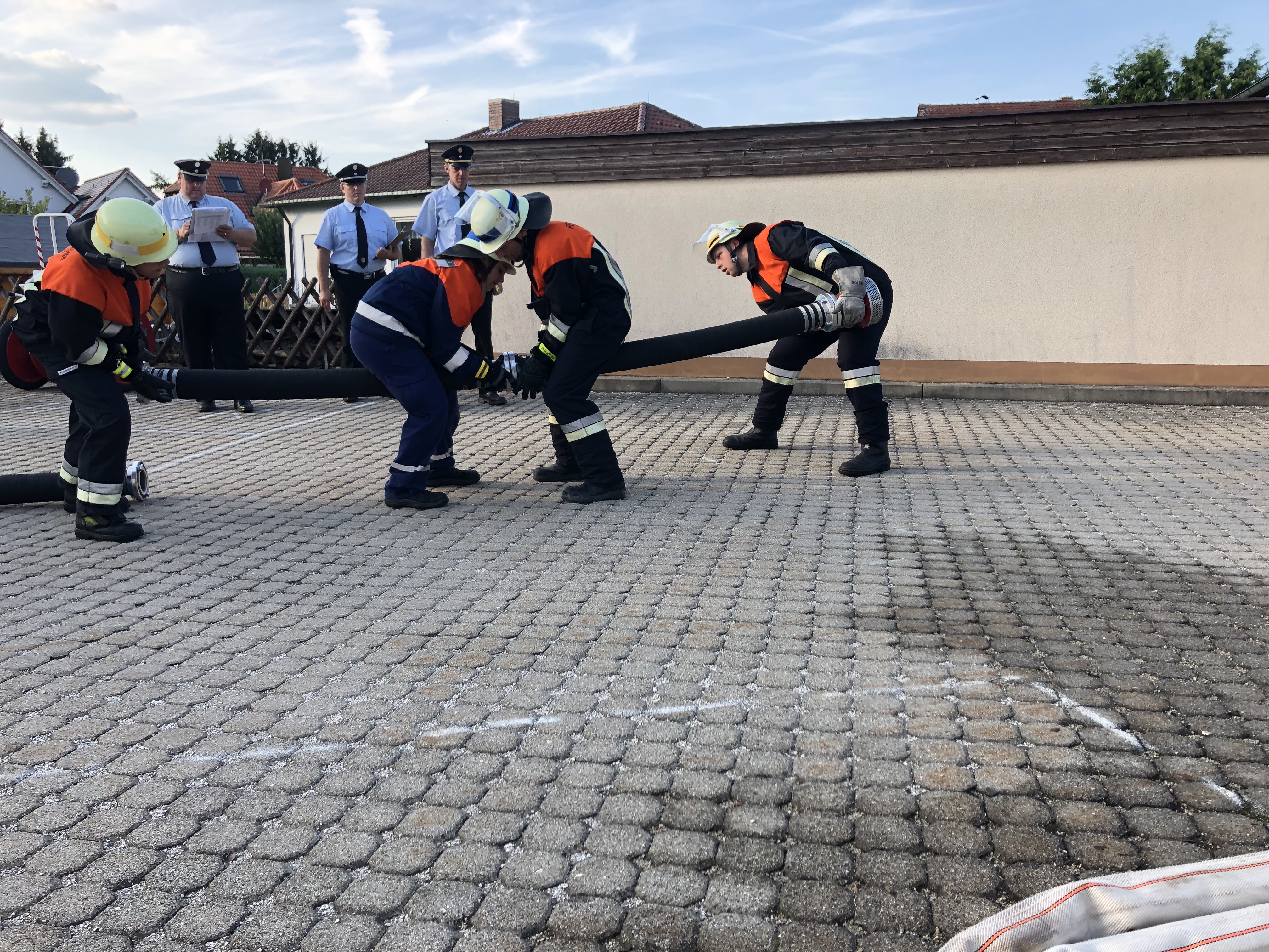 Heute waren zwei Gruppen der Freiwilligen Feuerwehr Pyrbaum bei ihrem Leistungsabzeichen „Gruppe im Löscheinsatz“ sehr erfolgreich. Sie zeigten dabei einen sauberen Löschaufbau. Dabei galt es in einer vorgegebenen Zeit eine Wasserversorgung von einem Hydranten und eine Verkehrsabsicherung herzustellen, sowie drei Strahlrohre vorzunehmen. Auch das Saugschlauchkuppeln und die Knotenkunde waren ein wichtiger Bestandteil der Abnahme. Je nach Stufe der Feuerwehrkameradinnen und Feuerwehrkameraden, wurden auch noch die jeweiligen Zusatzaufgaben erfolgreich gemeistert.