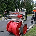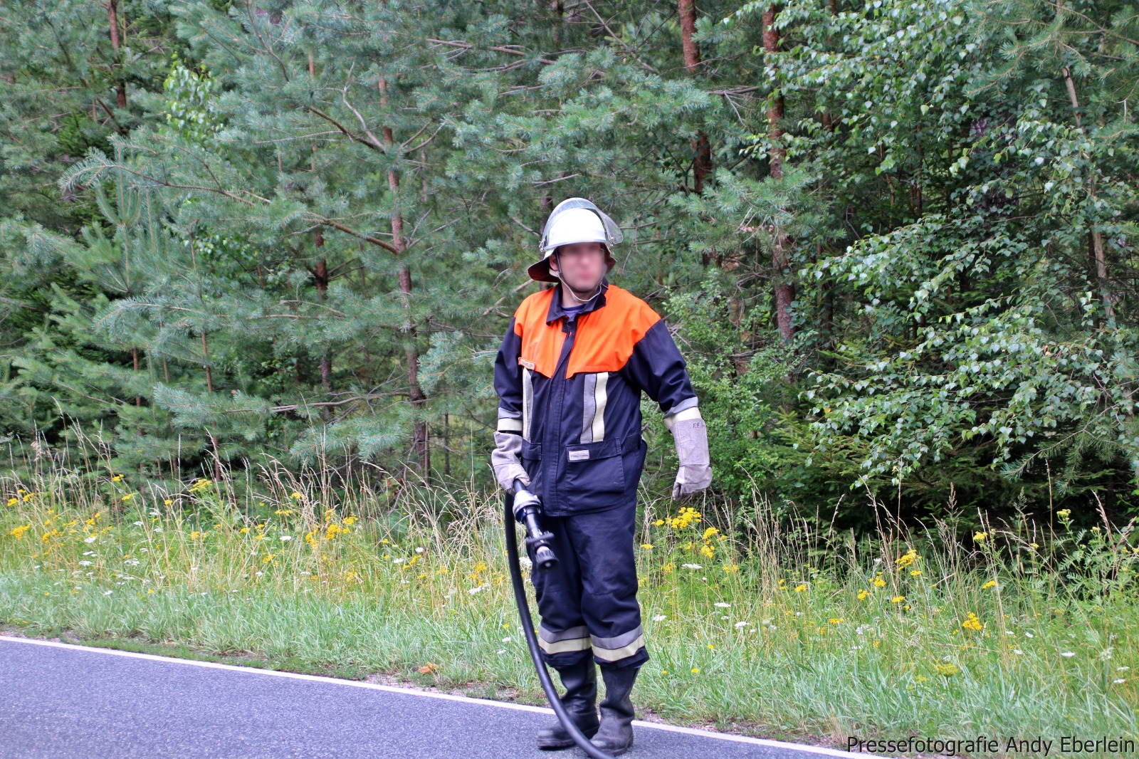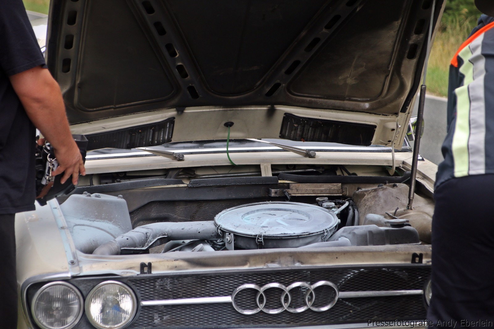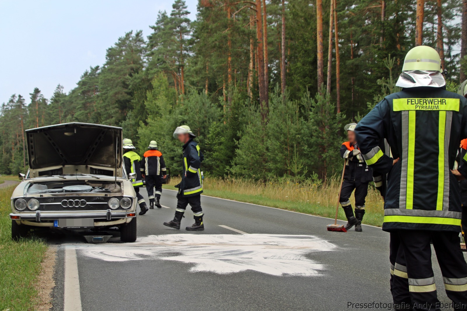 Auf der Verbindungsstraße zwischen Pyrbaum und Kemnath brannte ein AUDI-Oldtimer. Noch vor unserem Eintreffen konnte der Besitzer den Brand, welcher sich auf den Motorraum begrenzte, mit einem Pulverlöscher den er glücklicherweise mit sich führte, ablöschen. Wir stellten den Brandschutz sicher, kontrollierten mit einer Wärmebildkamera nochmals nach und nahmen ausgelaufene Betriebsmittel mit Ölbinder auf. Zudem wurde die Straße während der gesamten Einsatzdauer komplett gesperrt und der Verkehr umgeleitet.