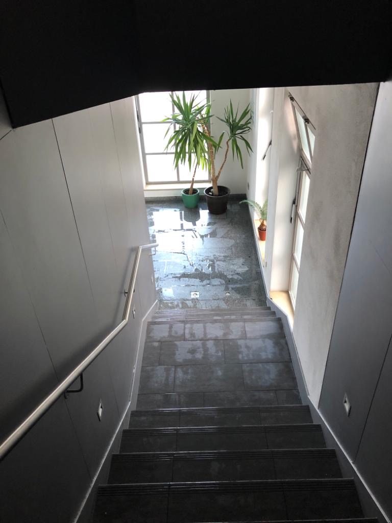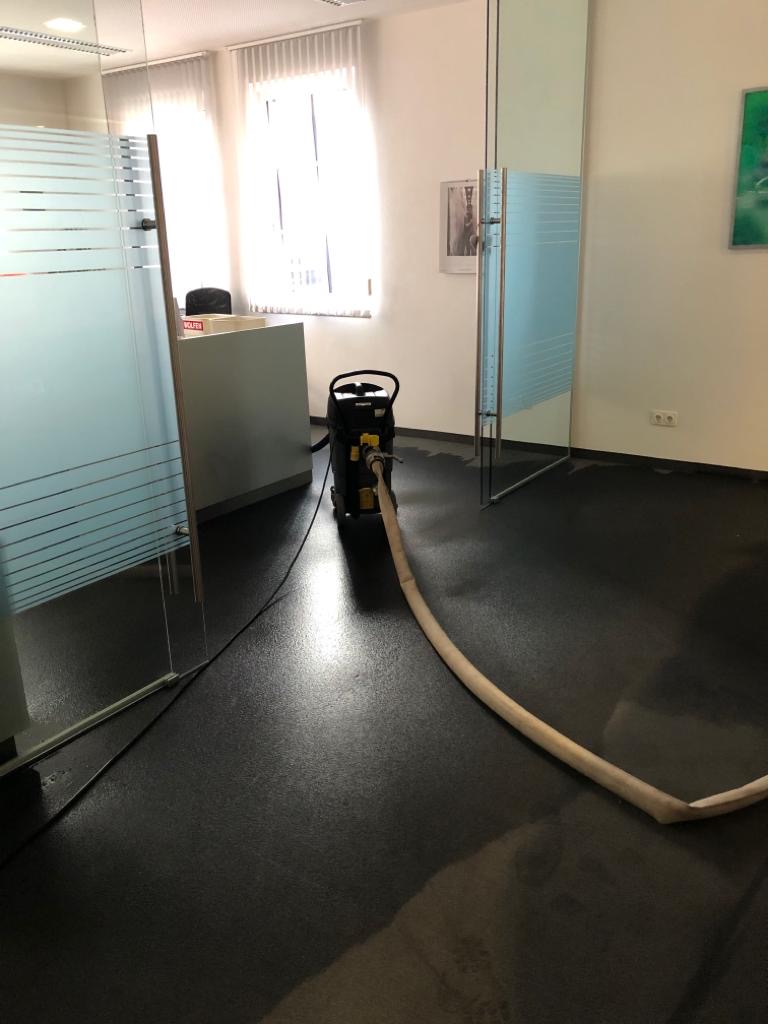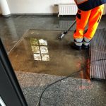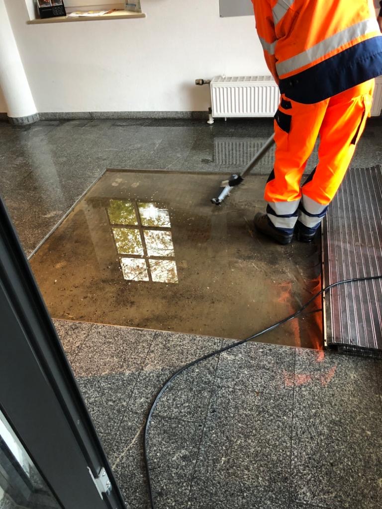 Aufgrund eines defekten Heißwasserschlauches lief unkontrolliert das Wasser über Nacht ins Gebäude und „flutete“ es langsam. Am frühen morgen wurde der Schaden entdeckt und die Feuerwehr alarmiert. Das Wasser suchte sich seinen Weg über das Treppenhaus und der Decke ins Geschoss darunter. Wir zogen das Wasser zusammen und saugten es mit Hilfe von Wassersaugern ab.