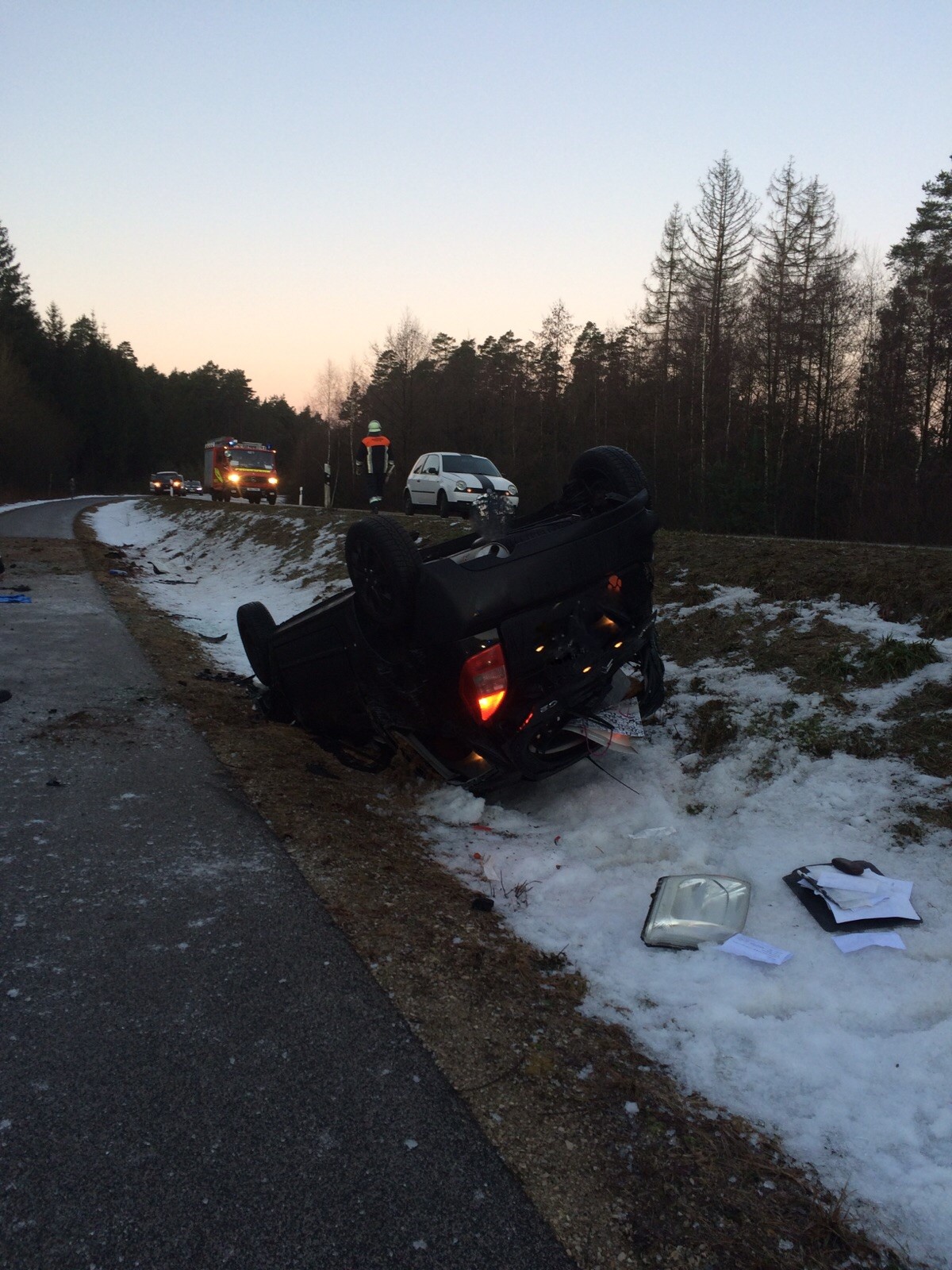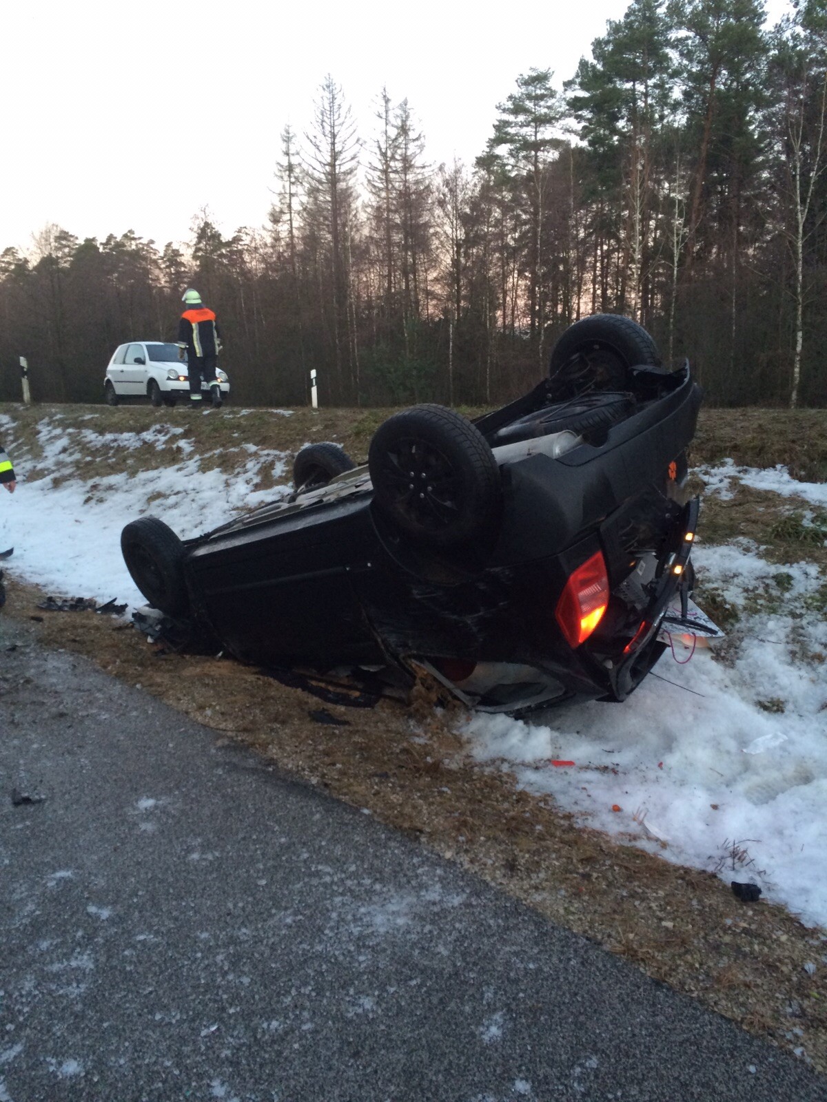 Auf der Verbindungsstraße NM6 Pyrbaum in Richtung Kemnath ereignete sich ein Verkehrsunfall. Zwei Autos kamen – unabhängig voneinander, aber aus gleichem Grund – von der Fahrbahn ab, da die Straße von einer gefährlichen, spiegelglatten Eisschicht bedeckt war. Der Fahrer des Citroen kam von der Fahrbahn ab, der Wagen überschlug sich und kam am Radweg auf dem Dach zum liegen. Der Fahrzeugführer kam mit dem BRK ins Krankenhaus.