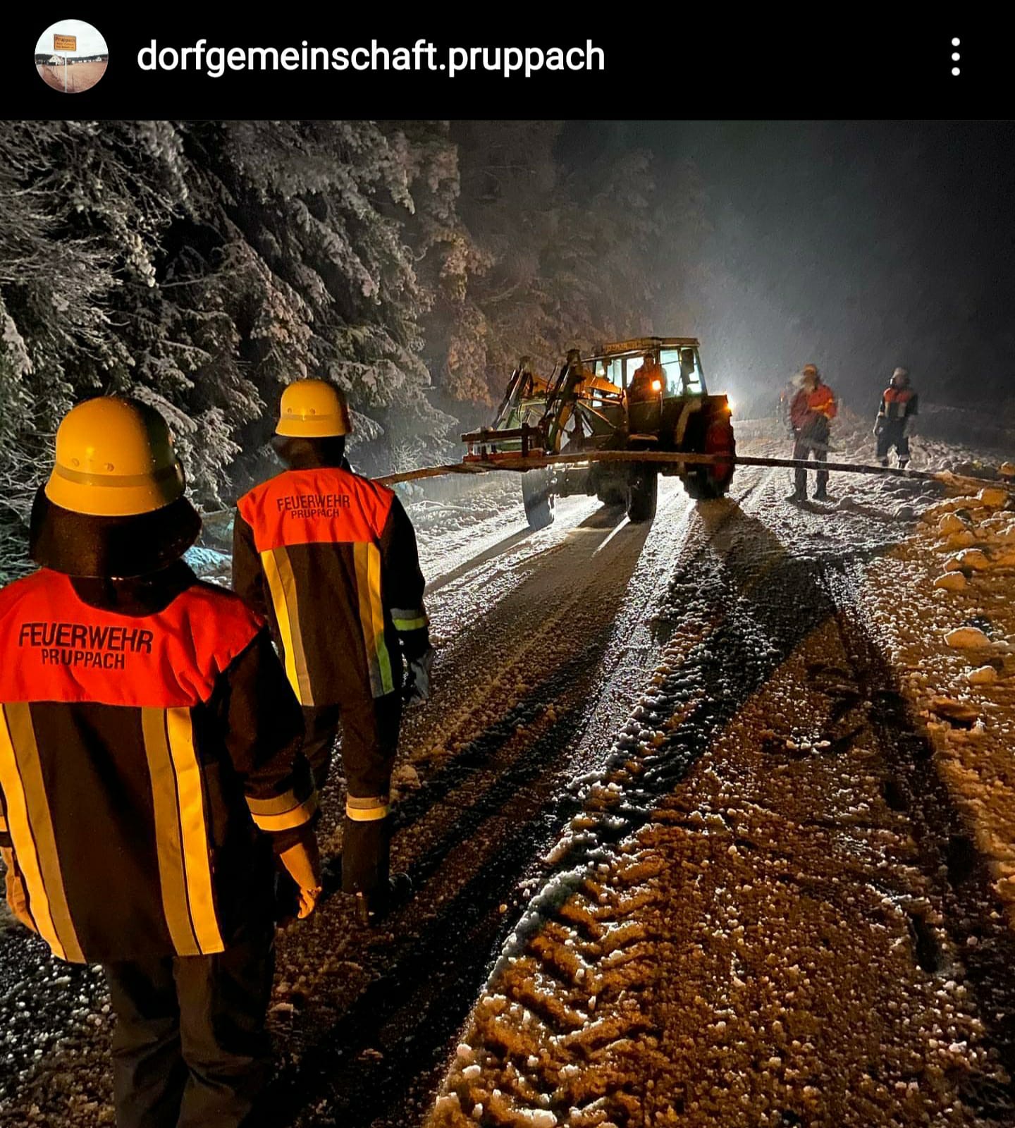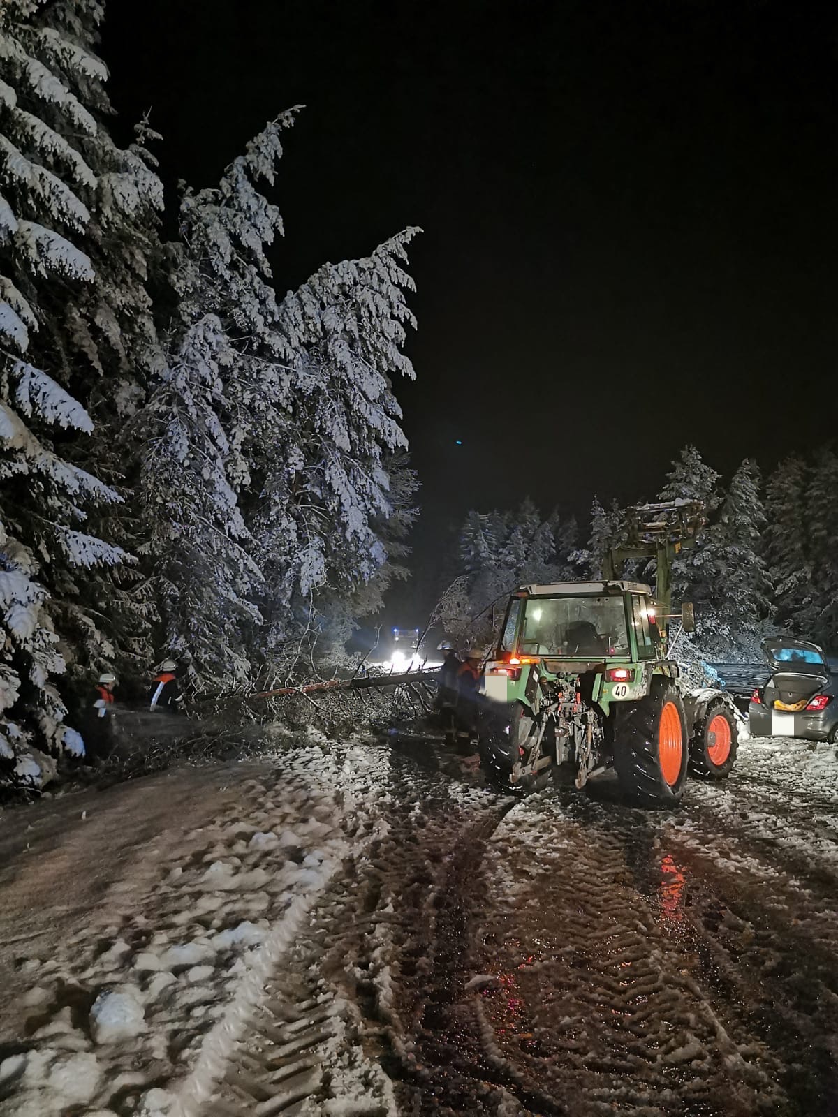 Aufgrund des lang anhaltenden Schneefalls und das schwere Gewicht des Schnees, konnten einige Bäume diesem nicht mehr stand halten und fielen um. Besonders betroffen war der Bereich um Pruppach und der Straßmühle auf der ST2225. Auch die Verbindungsstraße NM42 Pyrbaum in Richtung Unterferrieden war betroffen. Zusammen mit der Feuerwehr Pruppach beseitigten wir die Verkehrshindernisse. Zudem rutschte ein PKW in den Graben um nicht mit einem auf der Straße quer liegenden Baum zu kollidieren.