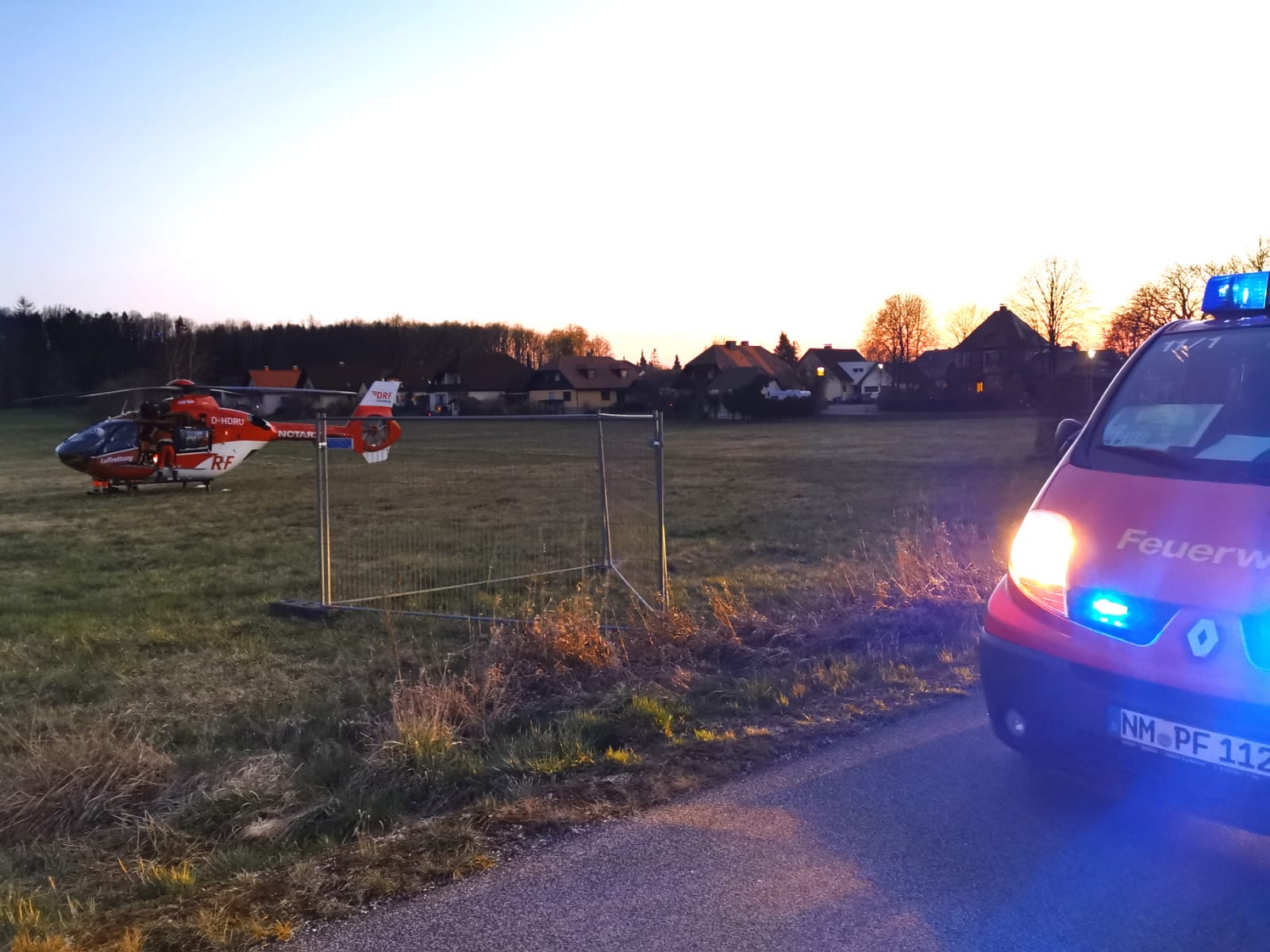 Eine Person benötigte dringend medizinische Hilfe, wofür auch der Rettungshubschrauber Christoph27 alarmiert wurde. Um die Besatzung des RTH´s vom Landeplatz zum Einsatzort zu transportieren wurde die Feuerwehr zur Unterstützung hinzugezogen. Wäre es erforderlich geworden, hätten wir den Landeplatz zusätzlich noch ausgeleuchtet.