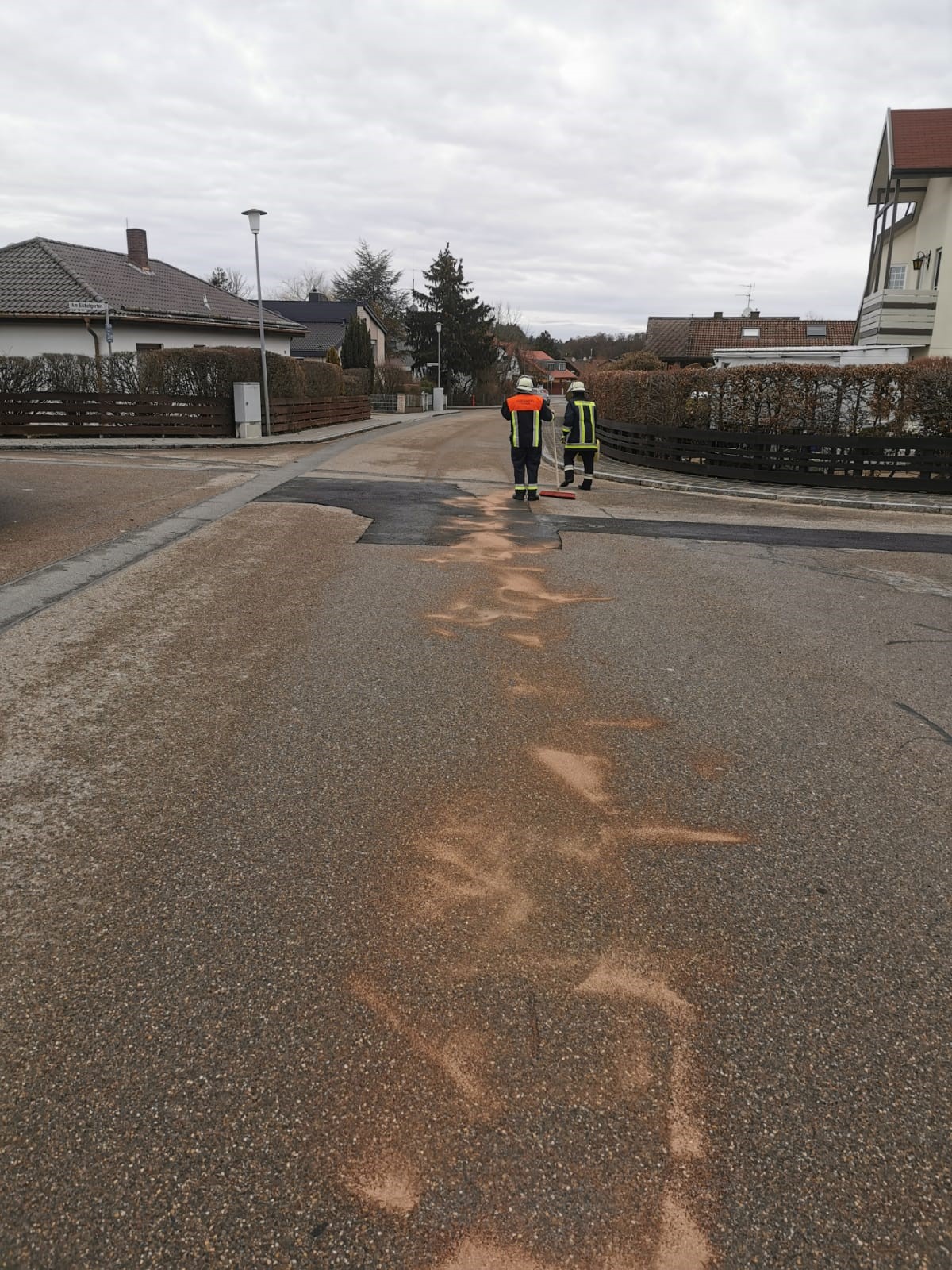 Ein Anwohner verständigte die Feuerwehr, das sich in seiner Straße eine längere Ölspur befindet. Bei Eintreffen konnte dies bestätigt werden. Die Fahrzeuge teilten sich auf und fuhren die Spur ab. Diese zog sich von der Neumarkter Straße, über den Eichelgarten, die Tannenstraße, Kurpfalzstraße, Ringstraße bis zur Jagdstraße, was einer Länge von gut 1,8 km entspricht. Nach Erkunden der Lage wurde der Betriebsstoff mit Bindemittel abgekehrt und vom örtlichen Bauhof wieder aufgenommen um die Gefahr für die Verkehrsteilnehmer zu beseitigen. Dieser stellte zusätzlich noch Ölspur-Schilder auf.