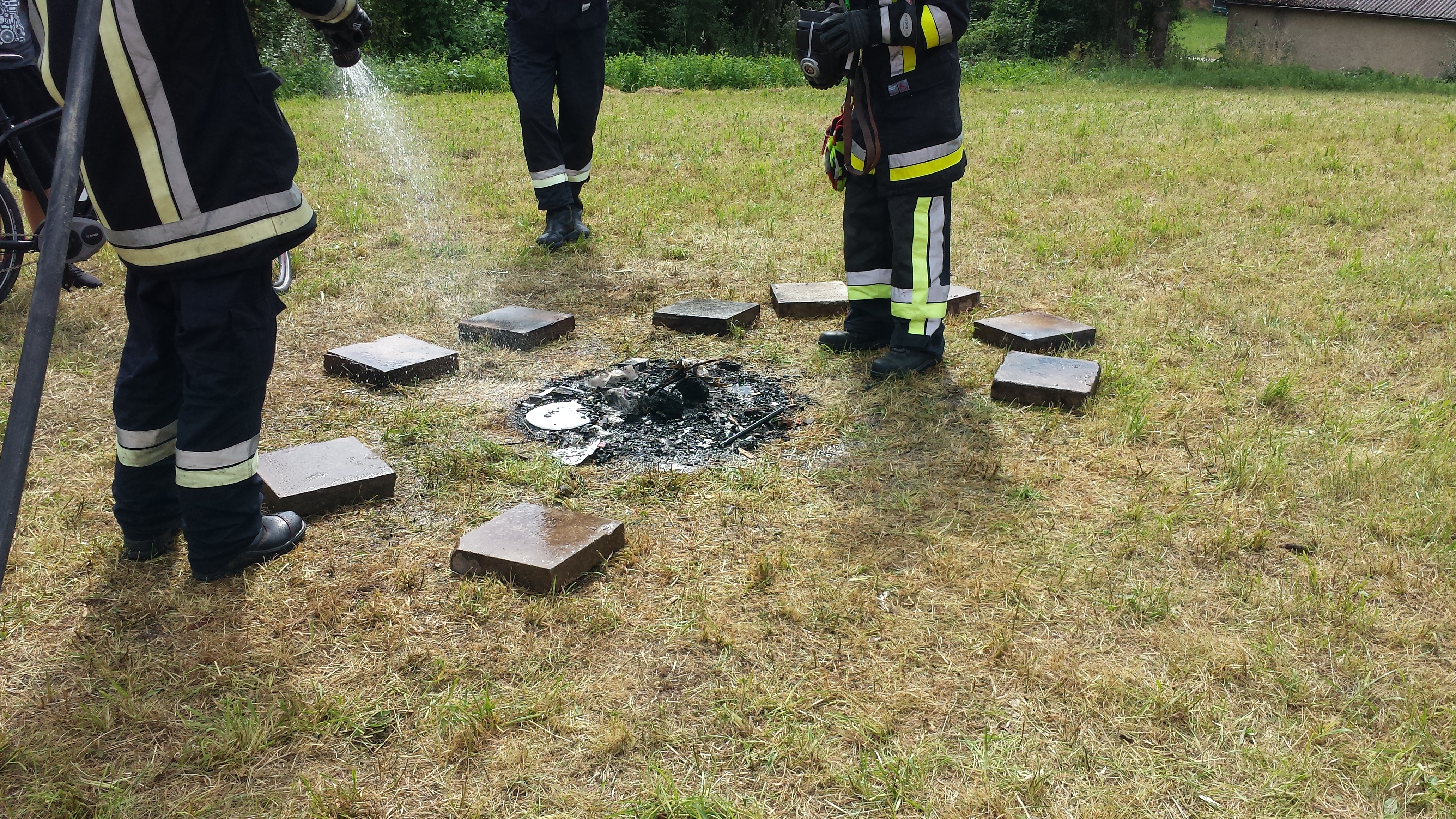 Ein aufmerksamer Spaziergänger entdeckte eine Feuerstelle auf einem Feld, die noch qualmte. Aufgrund der anhaltenden Trockenheit der vergangenen Tage und dem Wind heute hätte sich dies auch schnell zu einem Flächenbrand entwickeln können. Die Glut wurde mittels Schnellangriff abgelöscht und mit der Wärmebildkamera kontrolliert. Nach kurzer Zeit konnten wir in das Gerätehaus einrücken und unsere Einsatzbereitschaft wieder herstellen. Was auch sehr gut war, da gleich im Anschluss die Sirenen heulten und uns zu einem schweren Verkehrsunfall (siehe Einsatzbericht 32) mit brennendem Fahrzeug alarmierte.