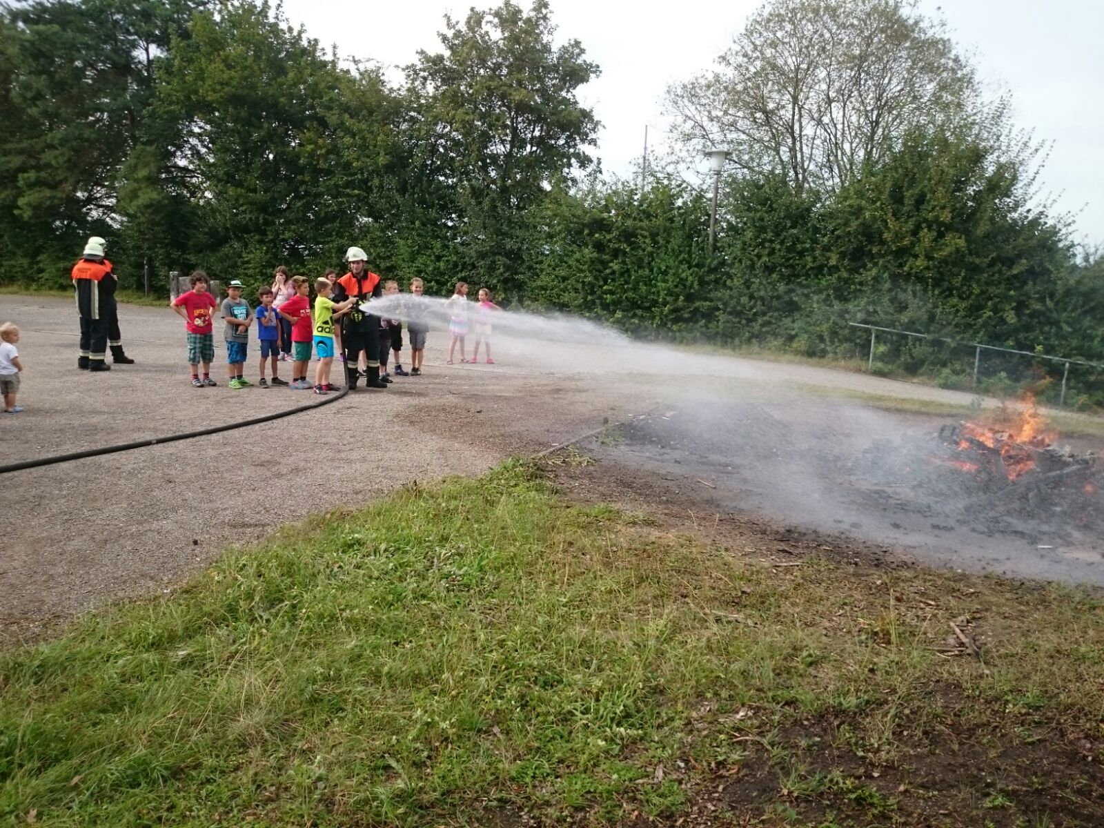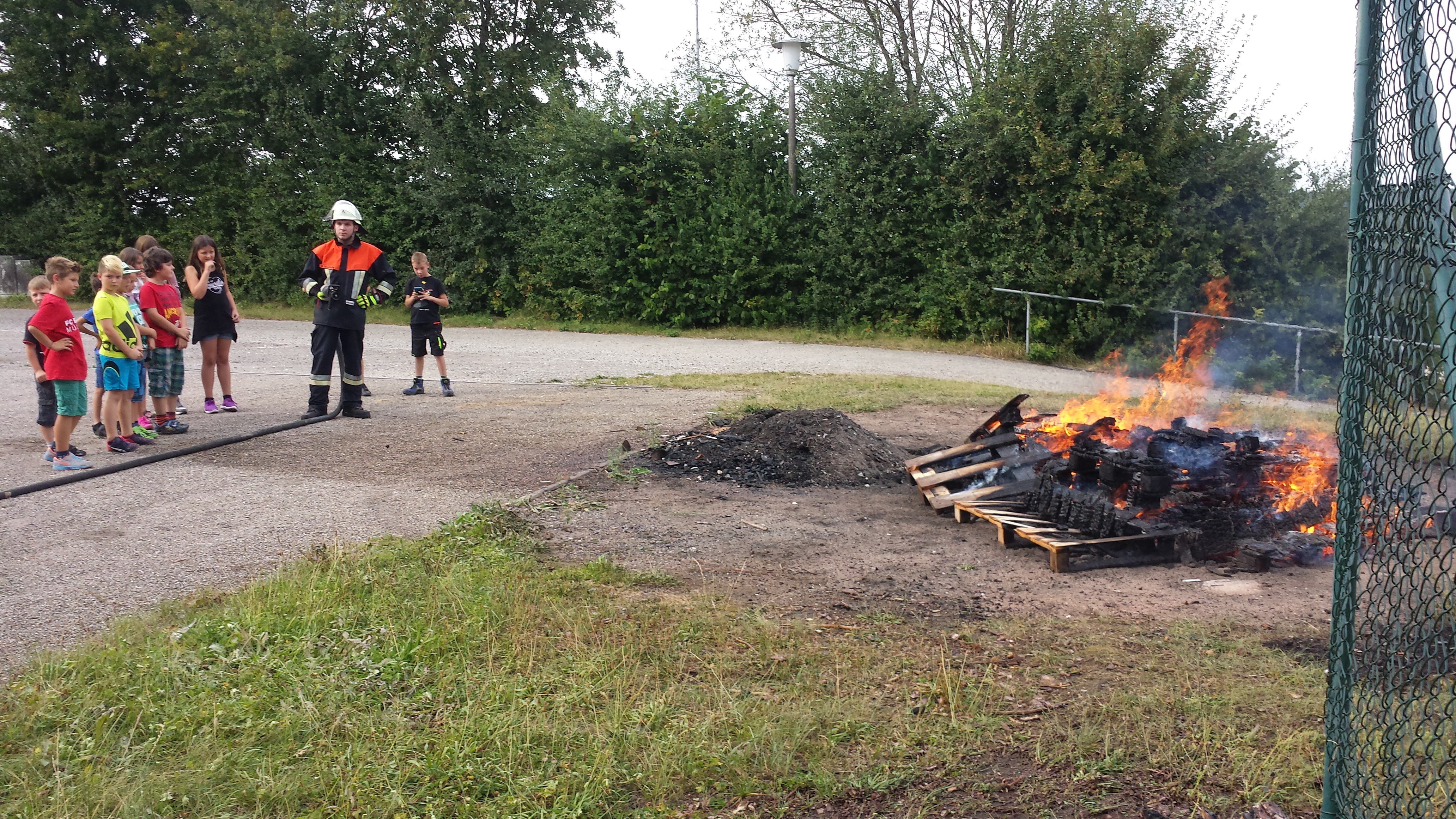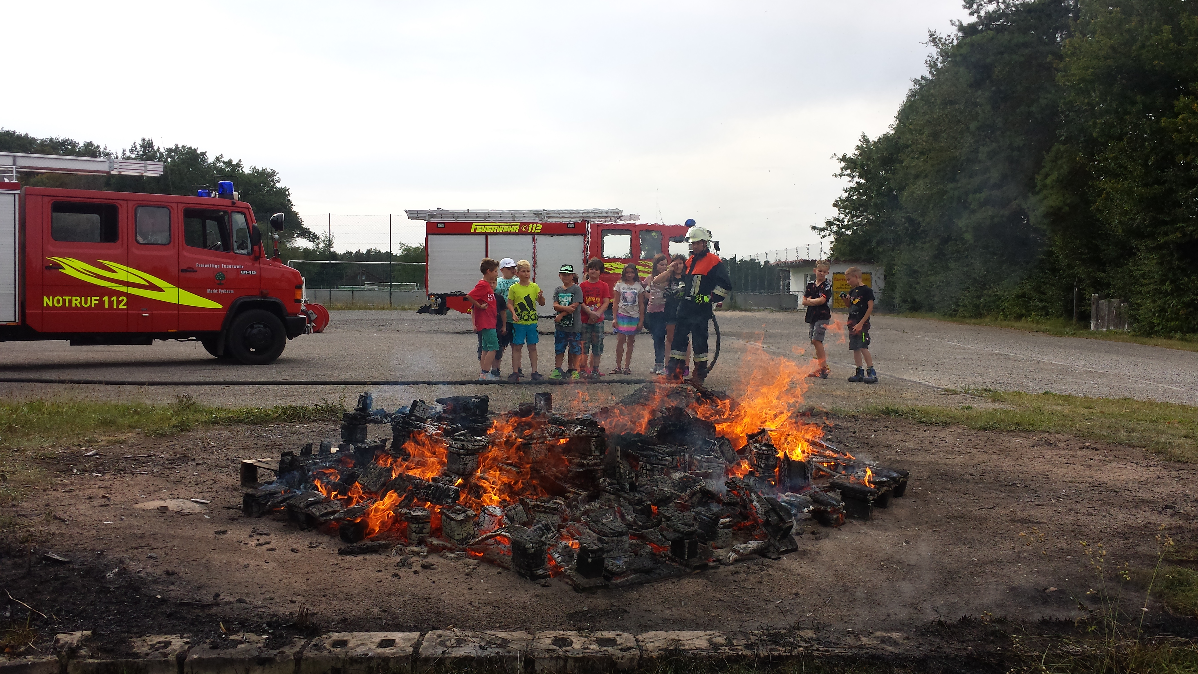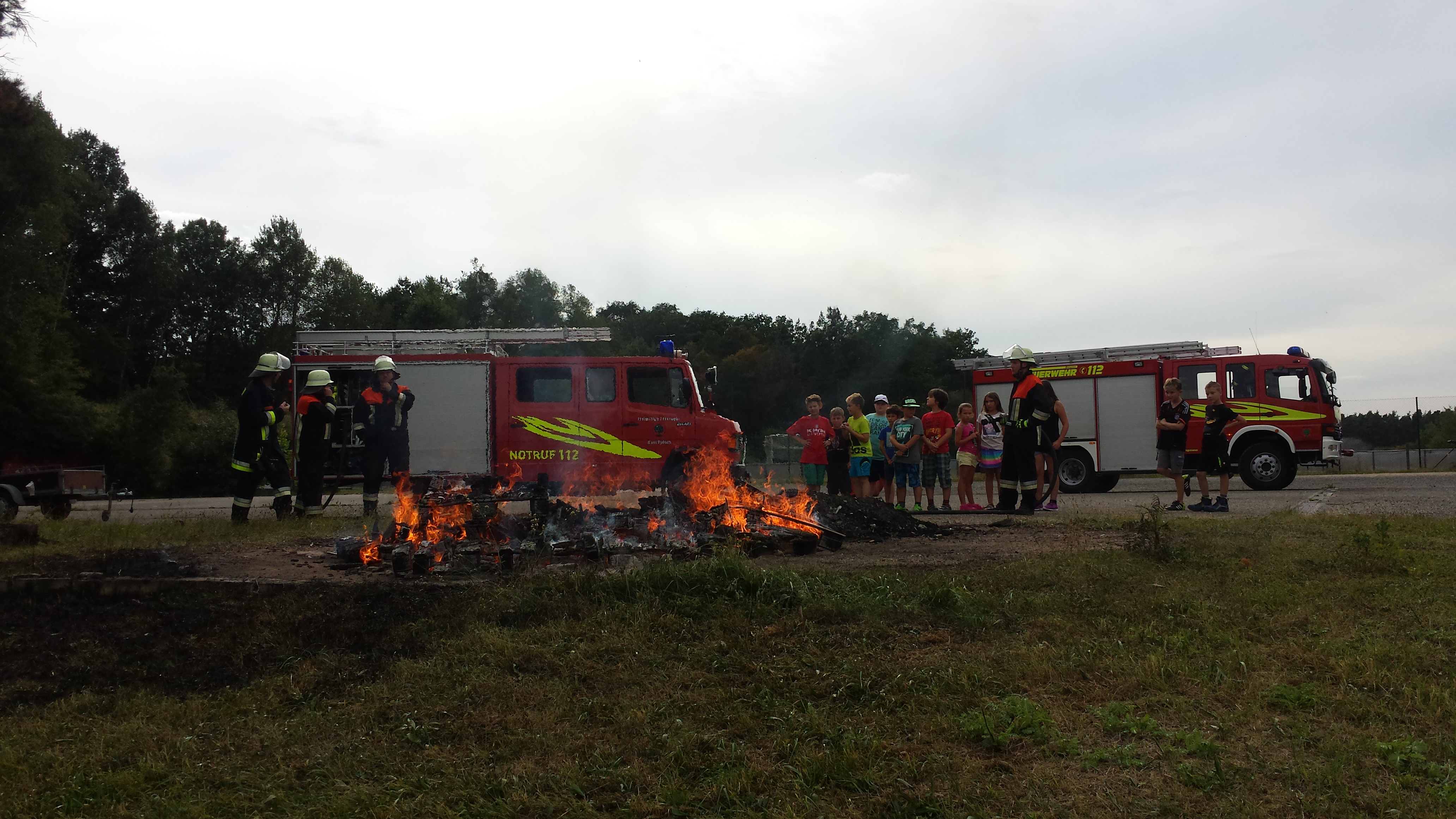 Die beiden Kommandanten Heinz Müller und Alexander Eckstein hatten ein sehr gutes Programm für alle Beteiligten. Als erstes gab es im Schulungsraum einen kleinen Vortrag über die Brandschutzerziehung und wie man einen Notruf richtig absetzt. Danach stand Fahrzeugkunde auf dem Programm, bei dem erklärt wurde was alles in einem Feuerwehrauto ist und auch wofür man es benötigt. Natürlich durfte eins nicht fehlen: Die Fahrt mit dem Feuerwehrauto. Zurück im Feuerwehrhaus wurde noch erklärt wie Rauchmelder funktionieren und wie ein Feuerwehrmann mit voller Ausrüstung im Ernstfall aussieht, damit man von diesem keine Angst zu haben braucht. Plötzlich wurden wir von einer „Alarmierung“ aus dem Unterricht gerissen. Gemeldet war ein Brand von mehreren Holzpaletten das es von den „Nachwuchs-Feuerwehrmännern“ zu löschen galt. Danach wurden die Geräte der technischen Hilfeleistung, wie Schere und Spreizer, usw. demonstriert.