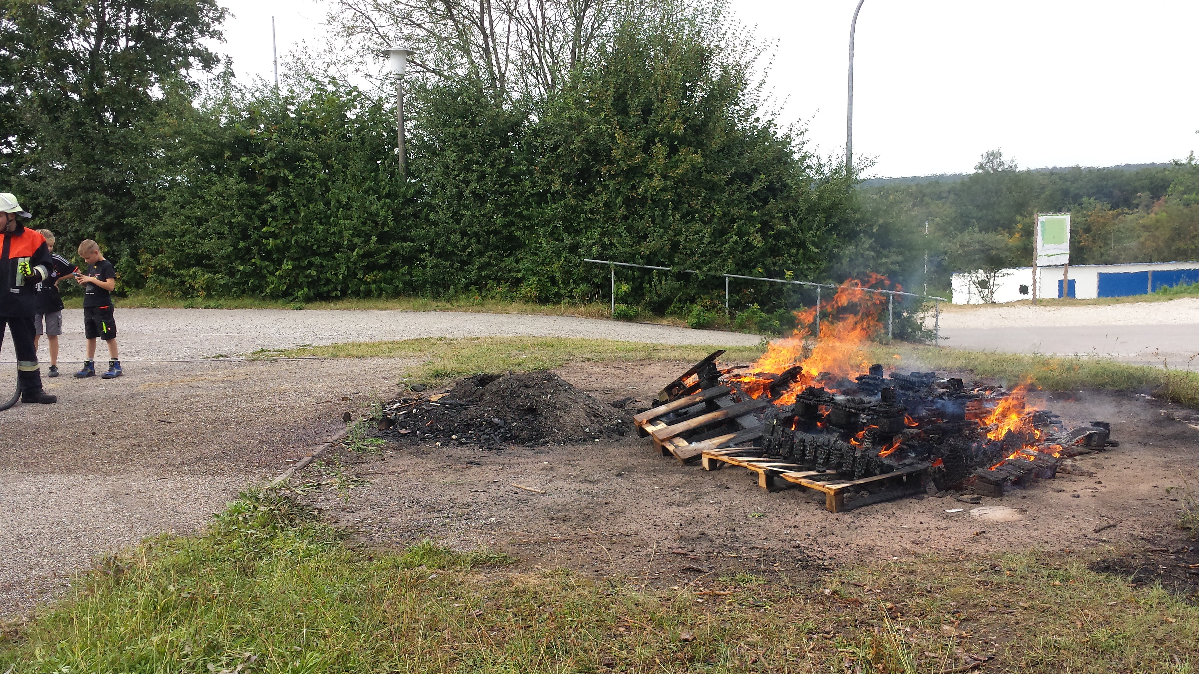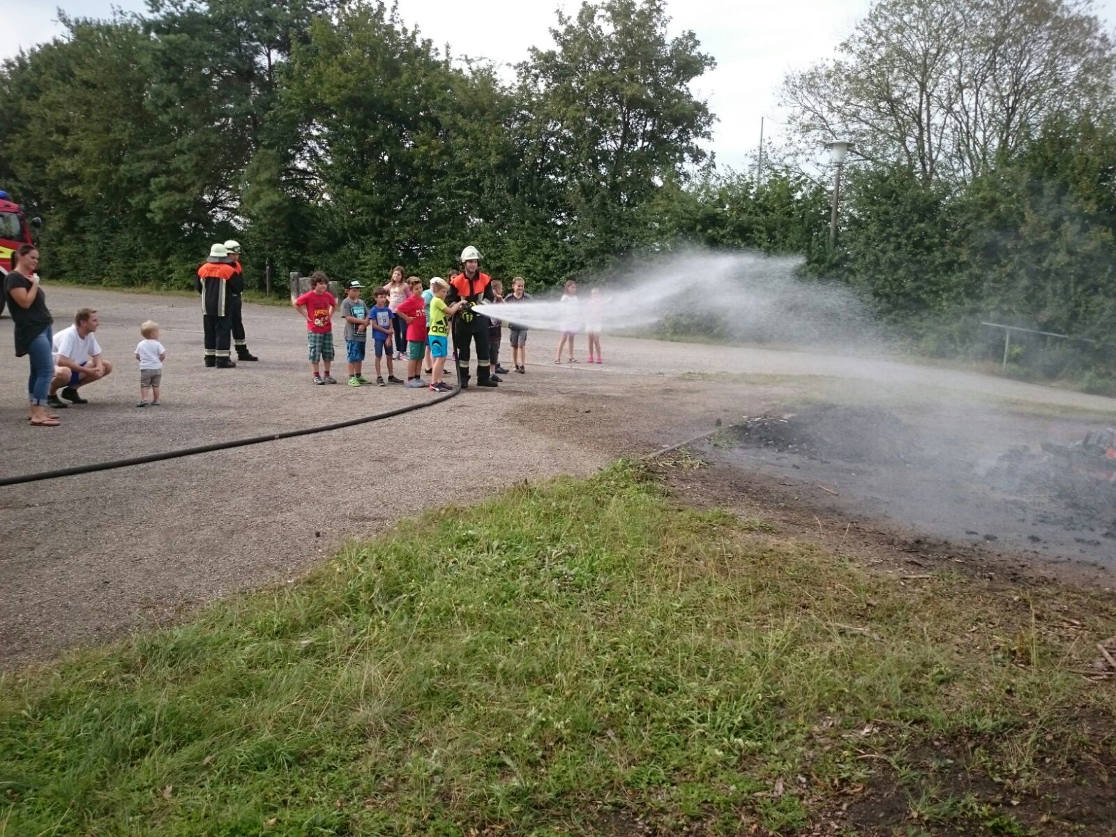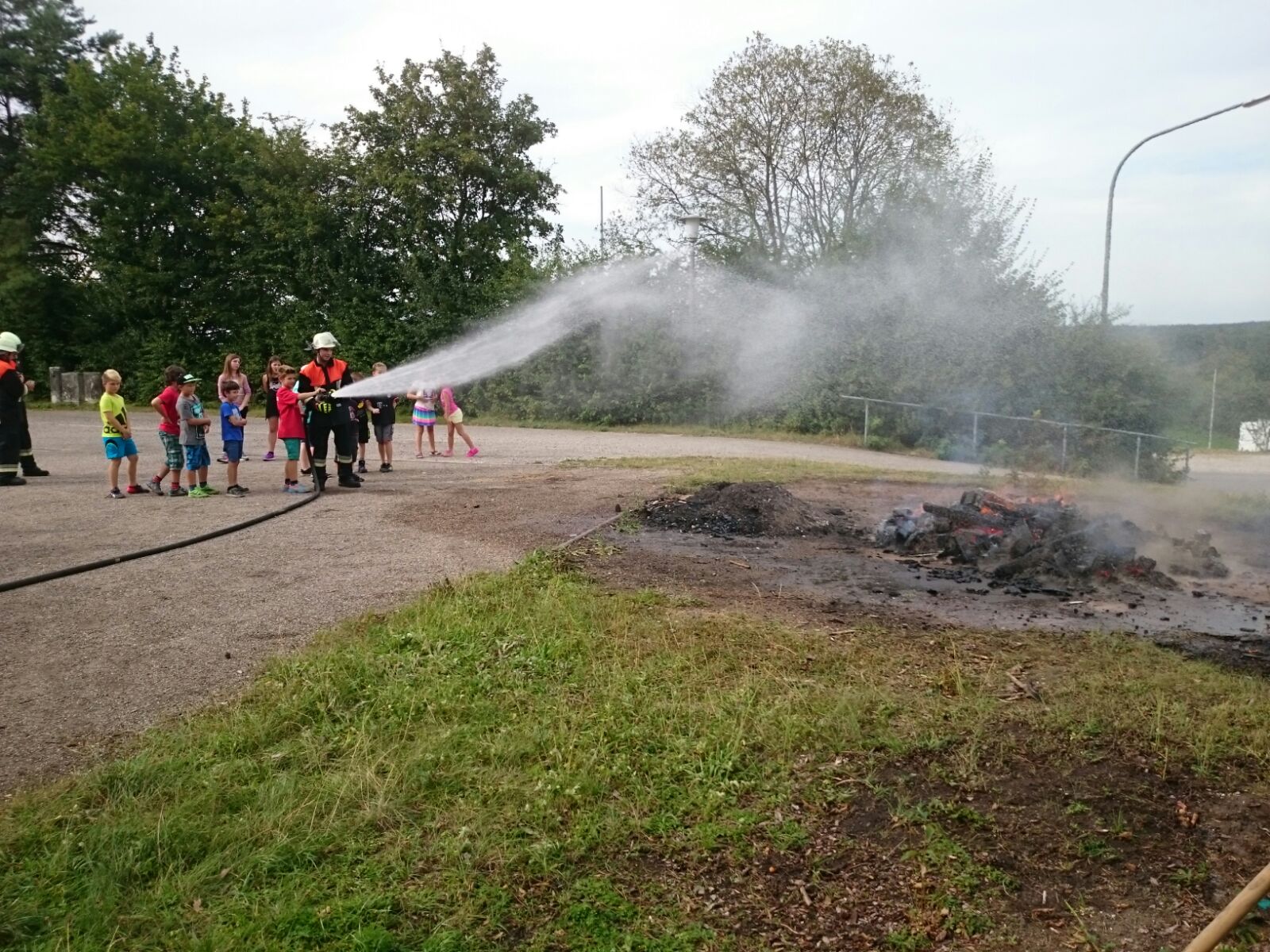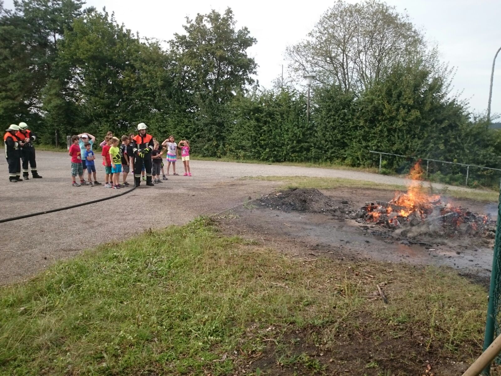 Die beiden Kommandanten Heinz Müller und Alexander Eckstein hatten ein sehr gutes Programm für alle Beteiligten. Als erstes gab es im Schulungsraum einen kleinen Vortrag über die Brandschutzerziehung und wie man einen Notruf richtig absetzt. Danach stand Fahrzeugkunde auf dem Programm, bei dem erklärt wurde was alles in einem Feuerwehrauto ist und auch wofür man es benötigt. Natürlich durfte eins nicht fehlen: Die Fahrt mit dem Feuerwehrauto. Zurück im Feuerwehrhaus wurde noch erklärt wie Rauchmelder funktionieren und wie ein Feuerwehrmann mit voller Ausrüstung im Ernstfall aussieht, damit man von diesem keine Angst zu haben braucht. Plötzlich wurden wir von einer „Alarmierung“ aus dem Unterricht gerissen. Gemeldet war ein Brand von mehreren Holzpaletten das es von den „Nachwuchs-Feuerwehrmännern“ zu löschen galt. Danach wurden die Geräte der technischen Hilfeleistung, wie Schere und Spreizer, usw. demonstriert.