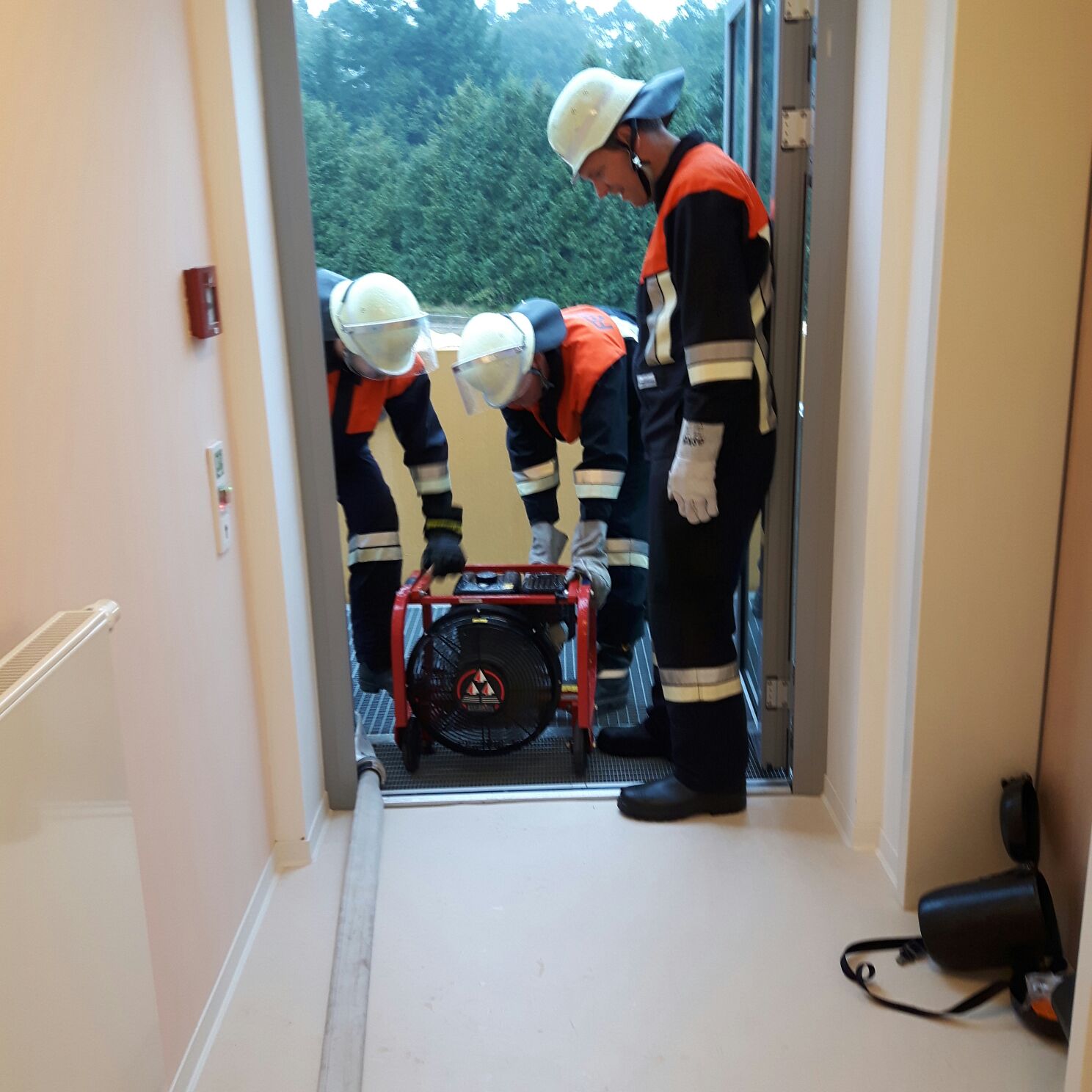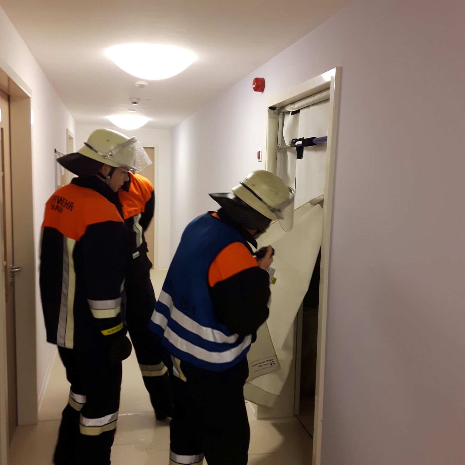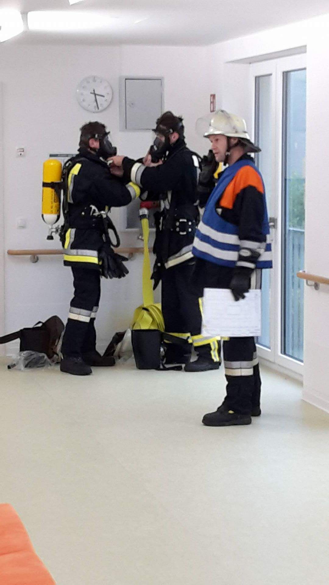 Angenommen wurde eine starke Rauchentwicklung im Verwaltungstrakt bzw. im dortigen Technikraum und der Heizung. Ein Trupp ging sofort unter schwerem Atemschutz und einem C-Rohr ins Gebäude vor und erkundete die Lage. Um den rauchfreien Bereich nicht zu verqualmen wurde ein sogenannter Rauchvorhang eingesetzt. In der Zwischenzeit wurde die Wasserversorgung aufgebaut und ein Überdrucklüfter in Stellung gebracht. Ein weiterer Atemschutztrupp erkundete den Wohnbereich um sicher zu stellen das kein Rauch in diesen zog. Dort galt es einen verletzten Bewohner, dieser wurde von einem Jugendfeuerwehrler simuliert, zu retten. Mittlerweile konnte der Trupp im Brandraum das Feuer lokalisieren und bekämpfen, was durch die Wärmebildkamera massiv erleichtert wird. Nachdem dies dem Gruppenführer gemeldet wurde kam die Mitteilung das in diesem Bereich noch eine Person vermisst wird. Nach dem der Raum taktisch abgesucht wurde konnte auch hier mithilfe der Wärmebildkamera der vermisste schnell gefunden und durch den Atemschutztrupp ins freie gebracht werden. Nun galt es den fensterlosen Raum rauchfrei zu bringen, dazu musste der Schalter für den Rauchabzug gefunden werden. Nach betätigen des Schalters und des in Stellung gebrachten Überdrucklüfters war der Raum relativ schnell entraucht.