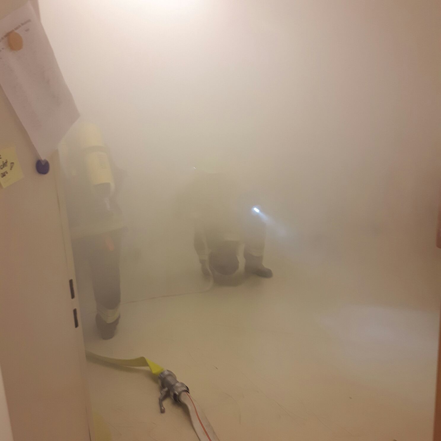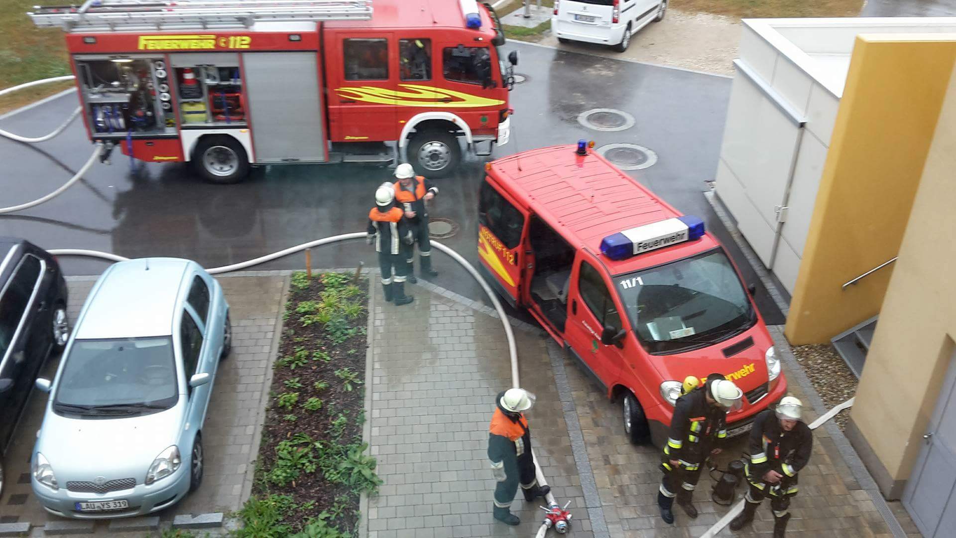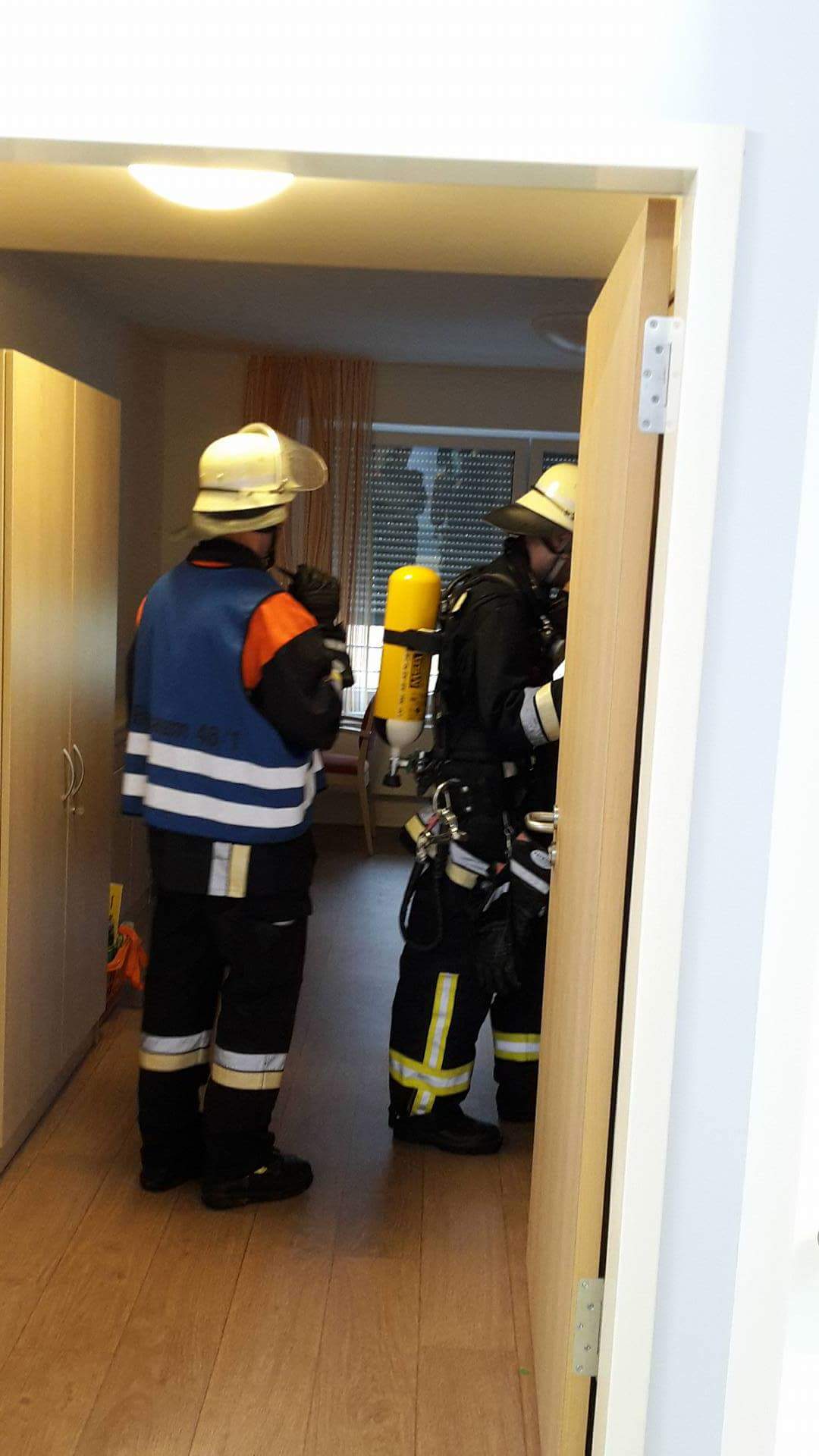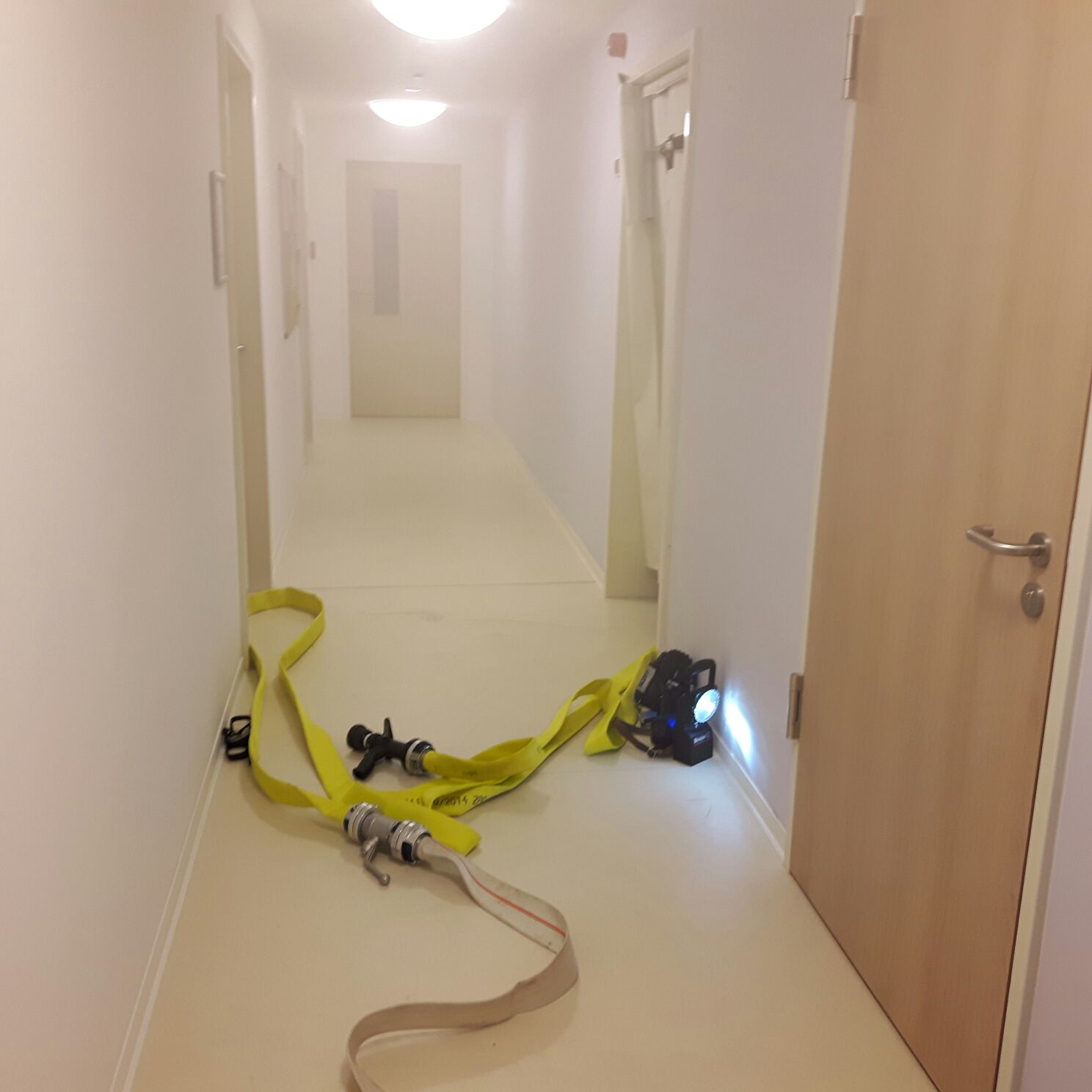 Angenommen wurde eine starke Rauchentwicklung im Verwaltungstrakt bzw. im dortigen Technikraum und der Heizung. Ein Trupp ging sofort unter schwerem Atemschutz und einem C-Rohr ins Gebäude vor und erkundete die Lage. Um den rauchfreien Bereich nicht zu verqualmen wurde ein sogenannter Rauchvorhang eingesetzt. In der Zwischenzeit wurde die Wasserversorgung aufgebaut und ein Überdrucklüfter in Stellung gebracht. Ein weiterer Atemschutztrupp erkundete den Wohnbereich um sicher zu stellen das kein Rauch in diesen zog. Dort galt es einen verletzten Bewohner, dieser wurde von einem Jugendfeuerwehrler simuliert, zu retten. Mittlerweile konnte der Trupp im Brandraum das Feuer lokalisieren und bekämpfen, was durch die Wärmebildkamera massiv erleichtert wird. Nachdem dies dem Gruppenführer gemeldet wurde kam die Mitteilung das in diesem Bereich noch eine Person vermisst wird. Nach dem der Raum taktisch abgesucht wurde konnte auch hier mithilfe der Wärmebildkamera der vermisste schnell gefunden und durch den Atemschutztrupp ins freie gebracht werden. Nun galt es den fensterlosen Raum rauchfrei zu bringen, dazu musste der Schalter für den Rauchabzug gefunden werden. Nach betätigen des Schalters und des in Stellung gebrachten Überdrucklüfters war der Raum relativ schnell entraucht.